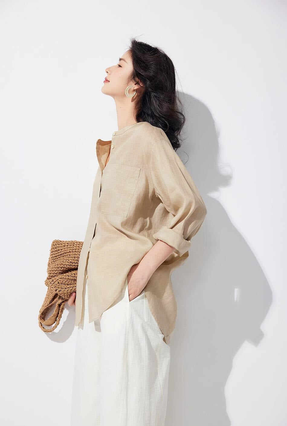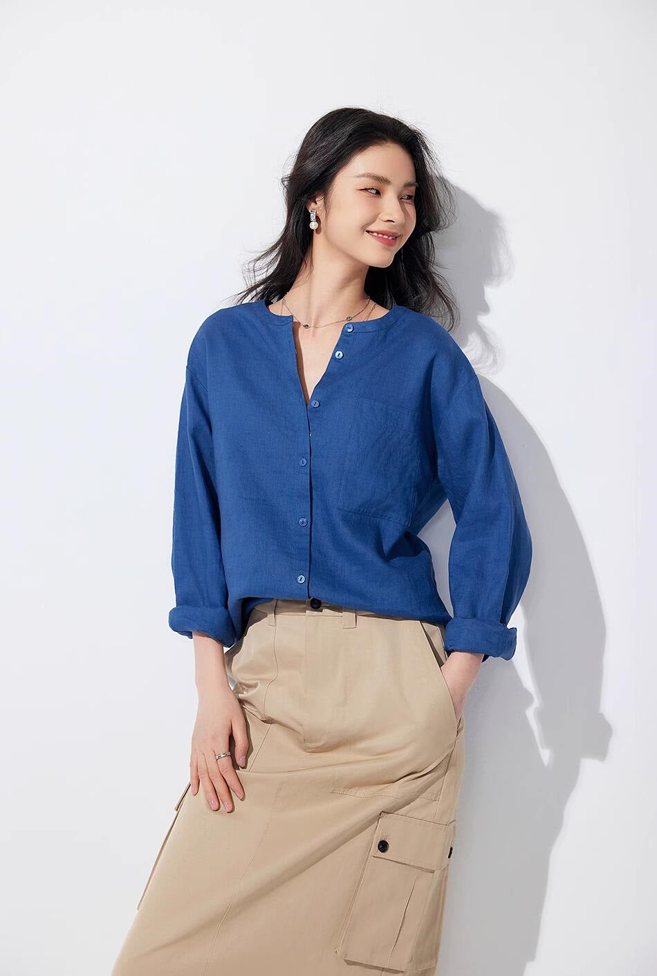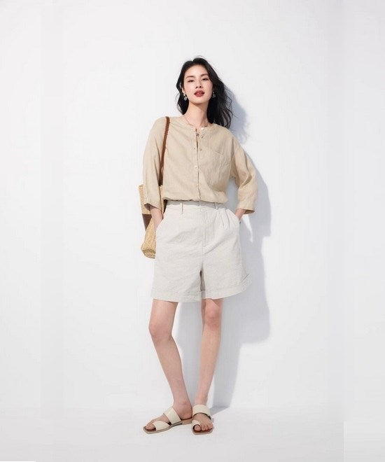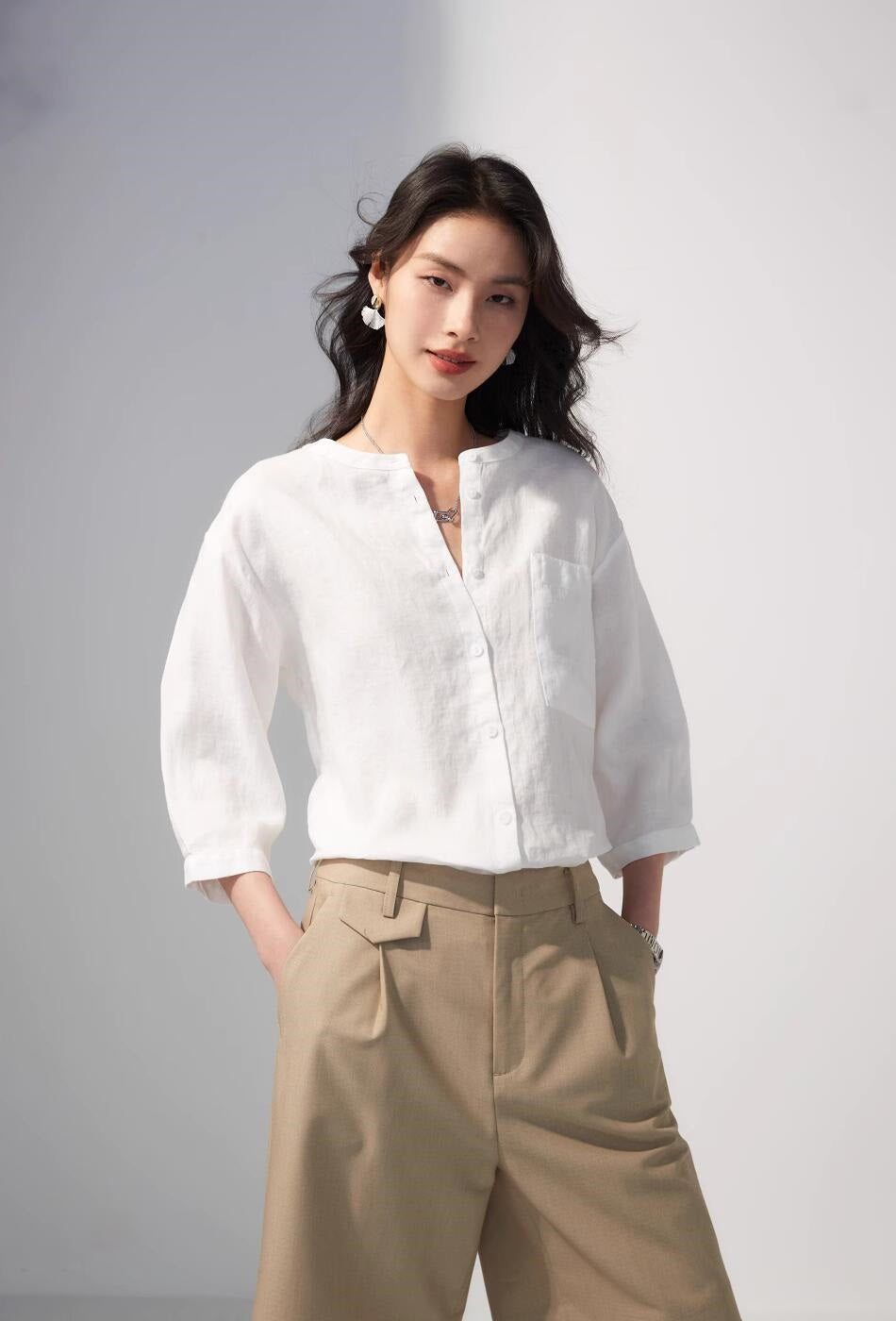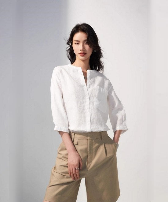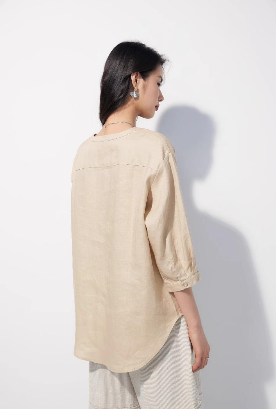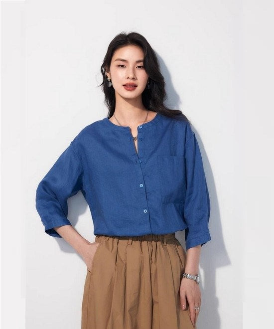 リネン七分袖ラウンドネックシャツ