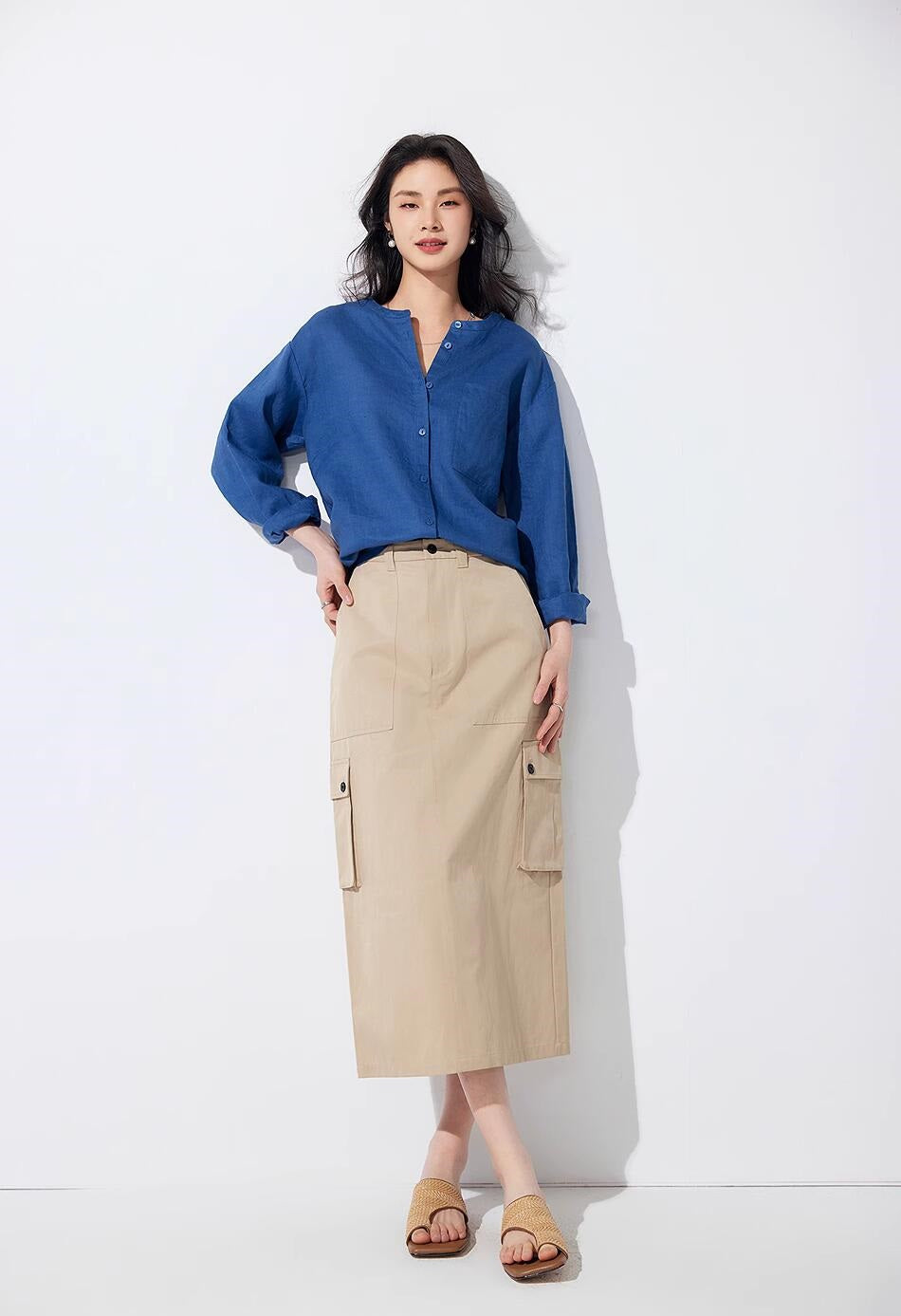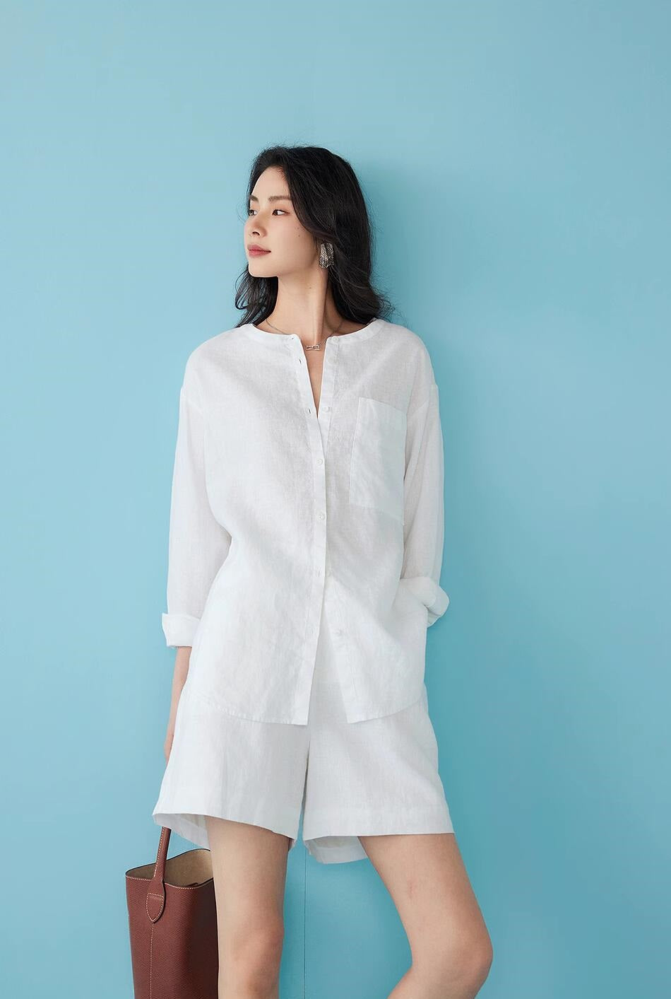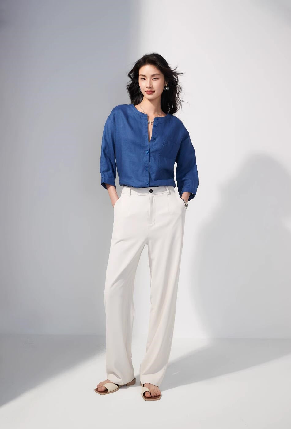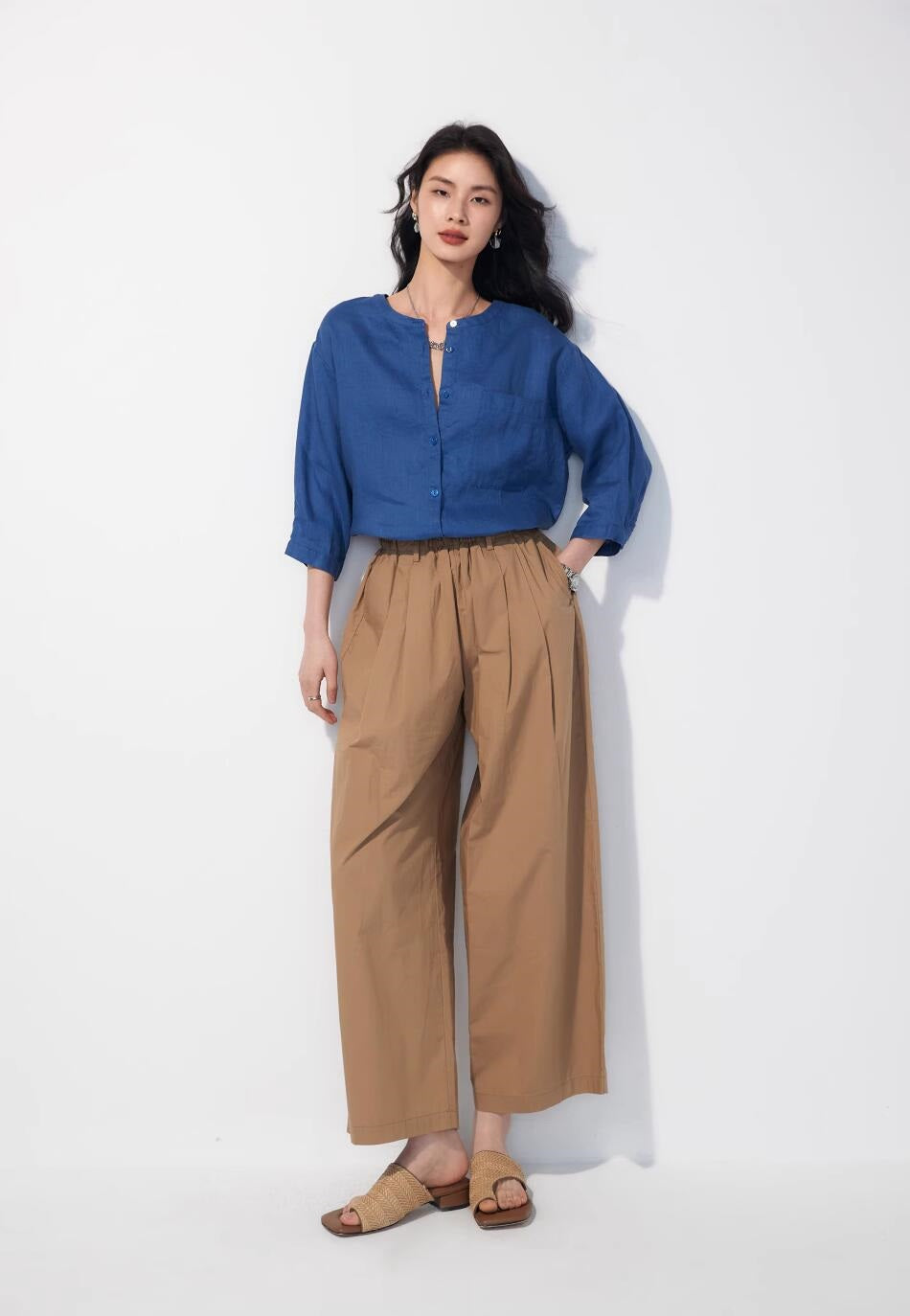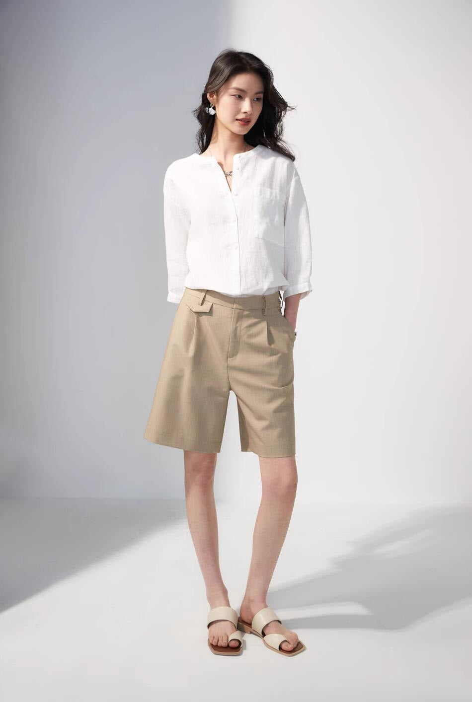 リネン七分袖ラウンドネックシャツ