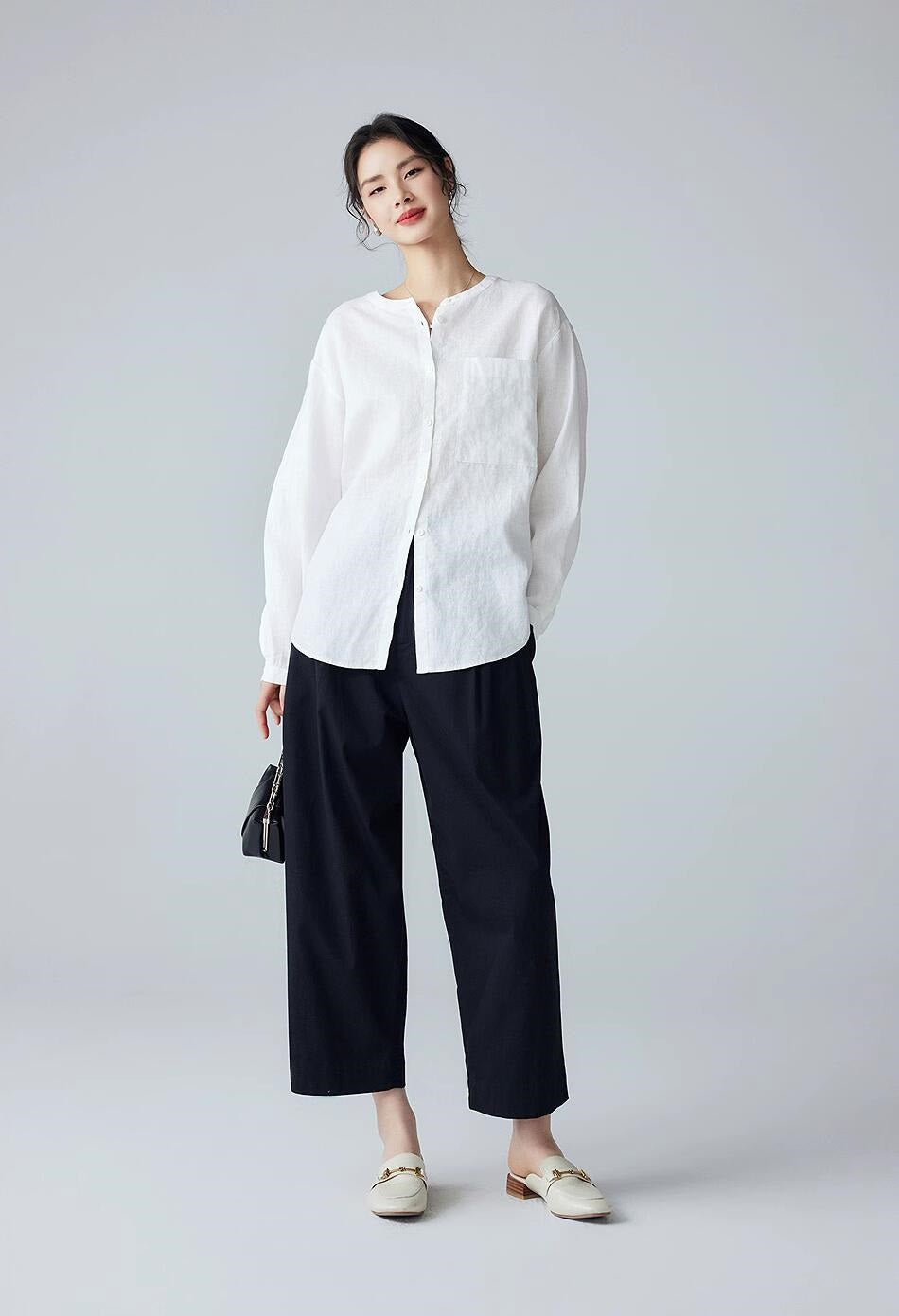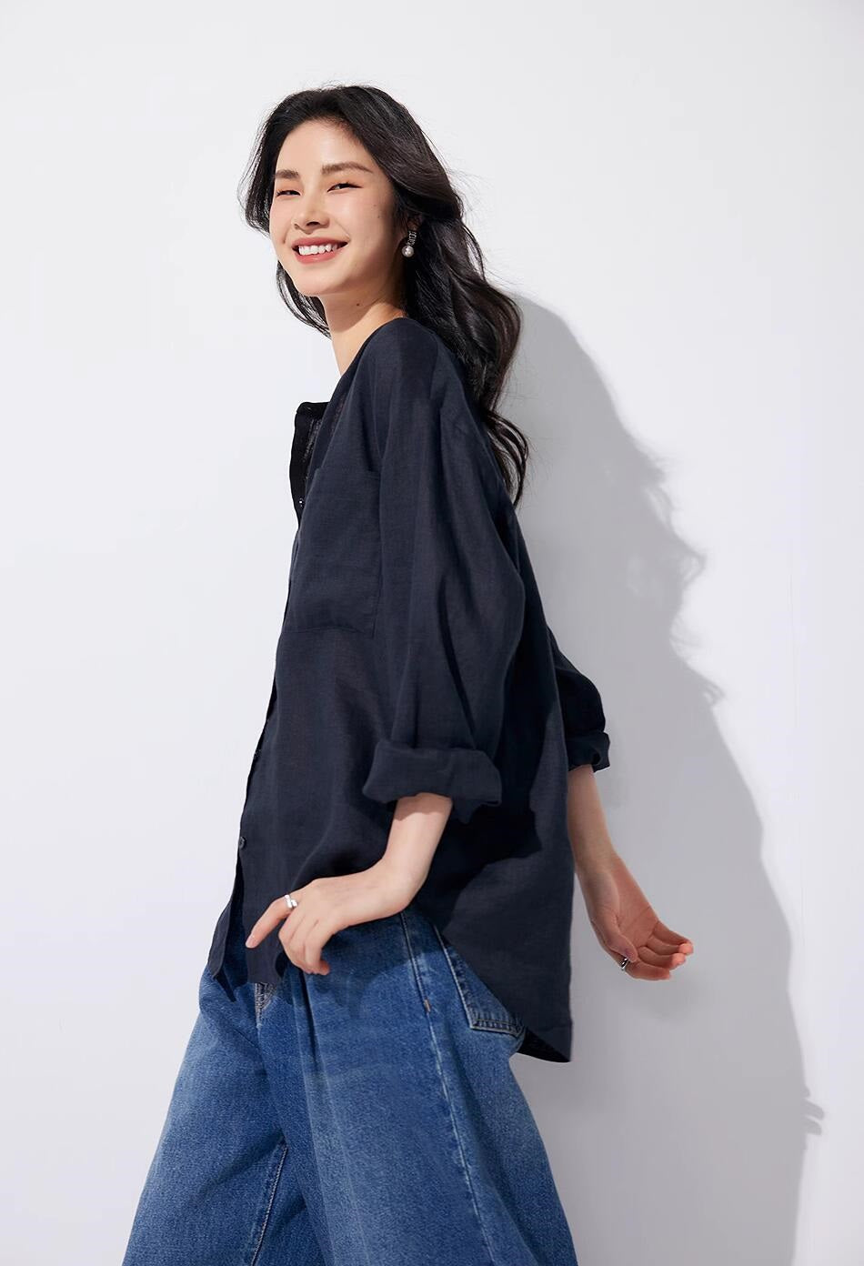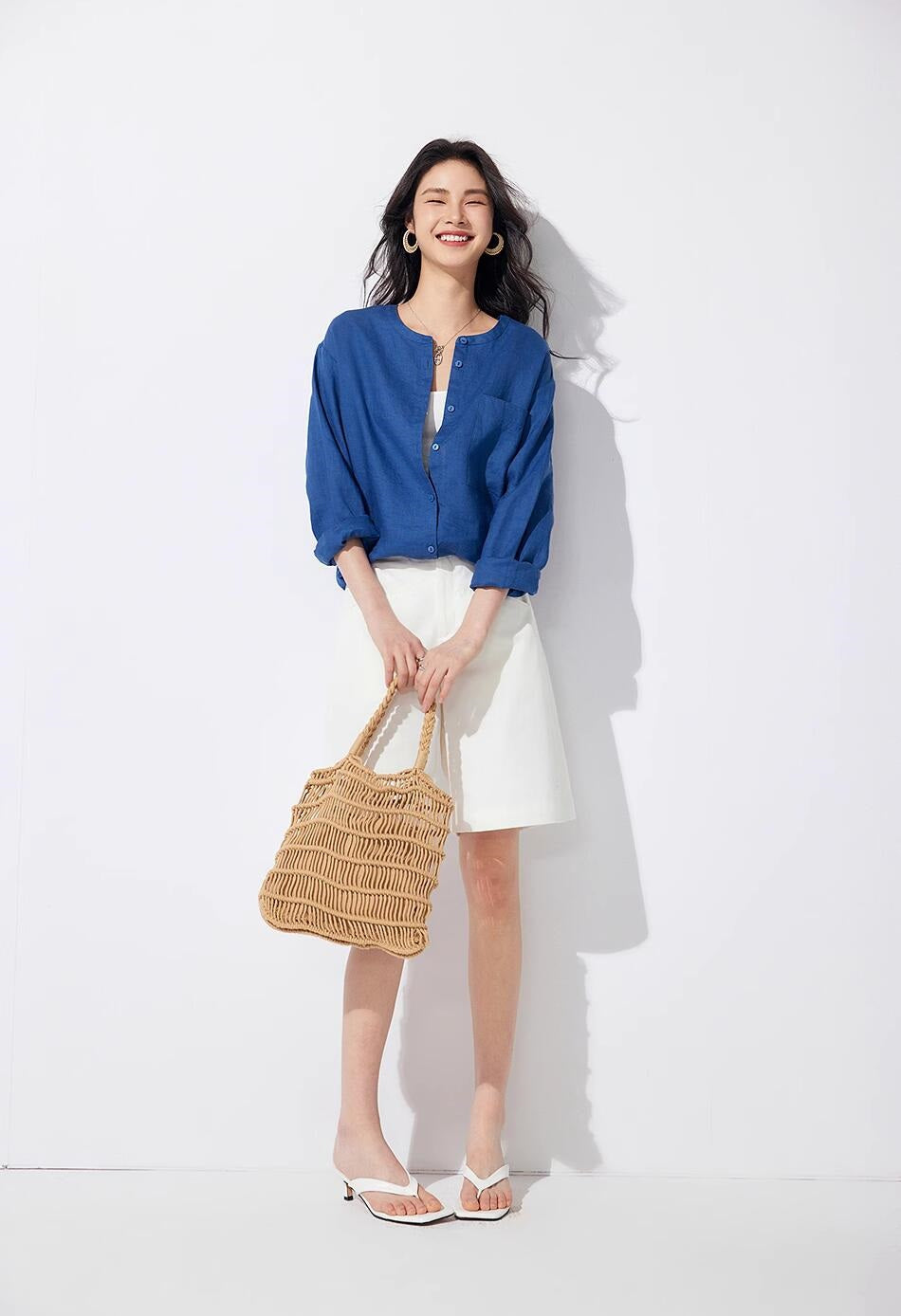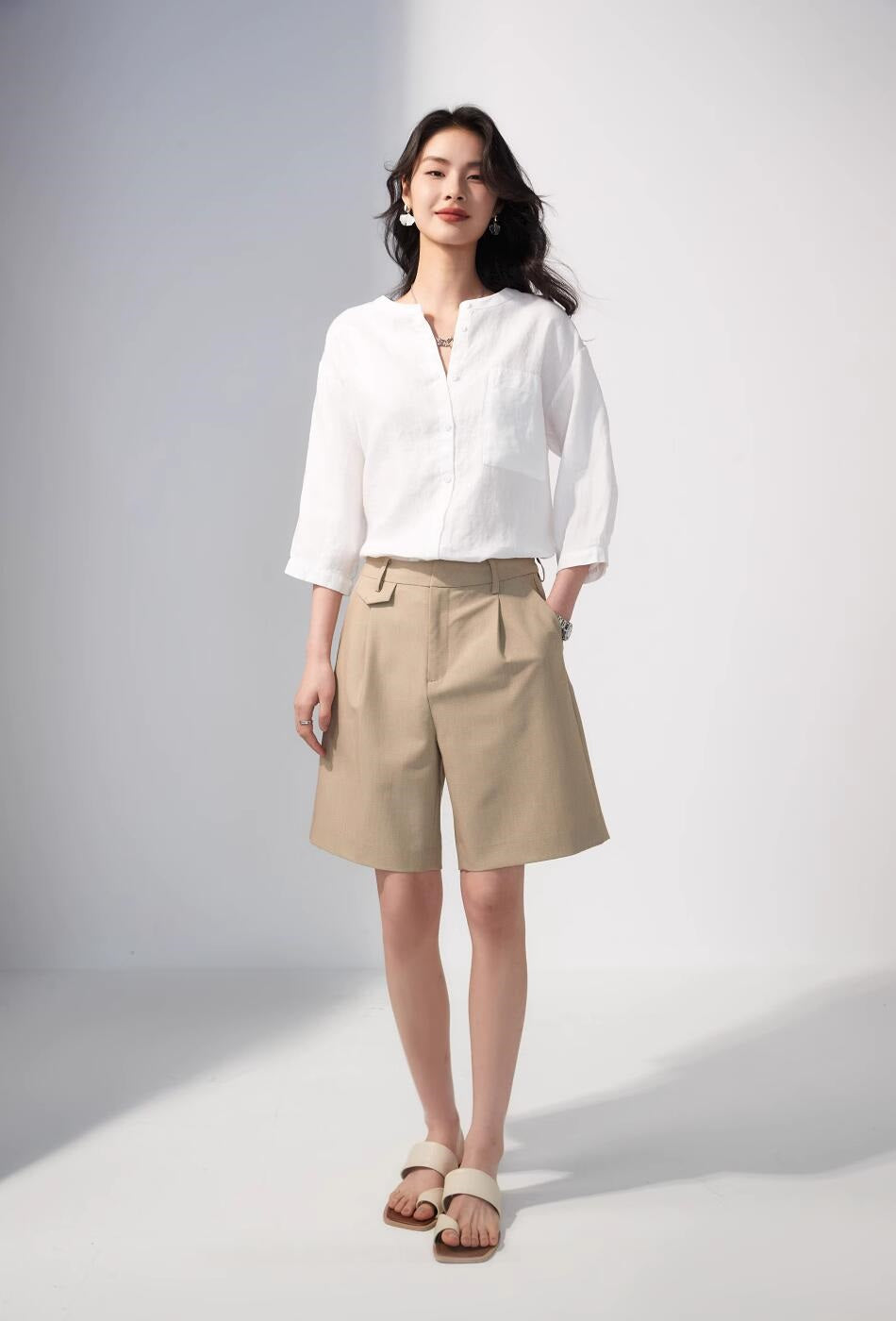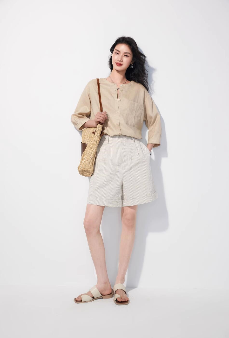 リネン七分袖ラウンドネックシャツ