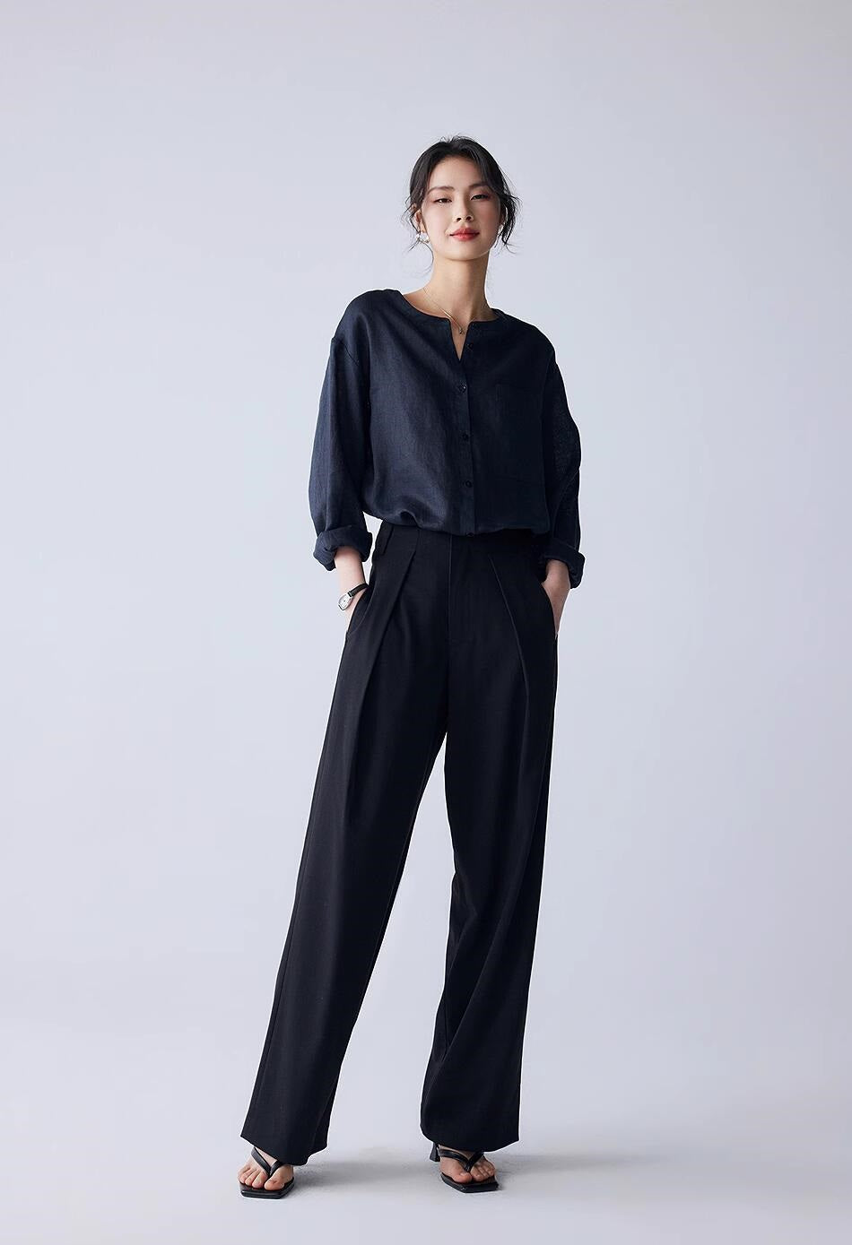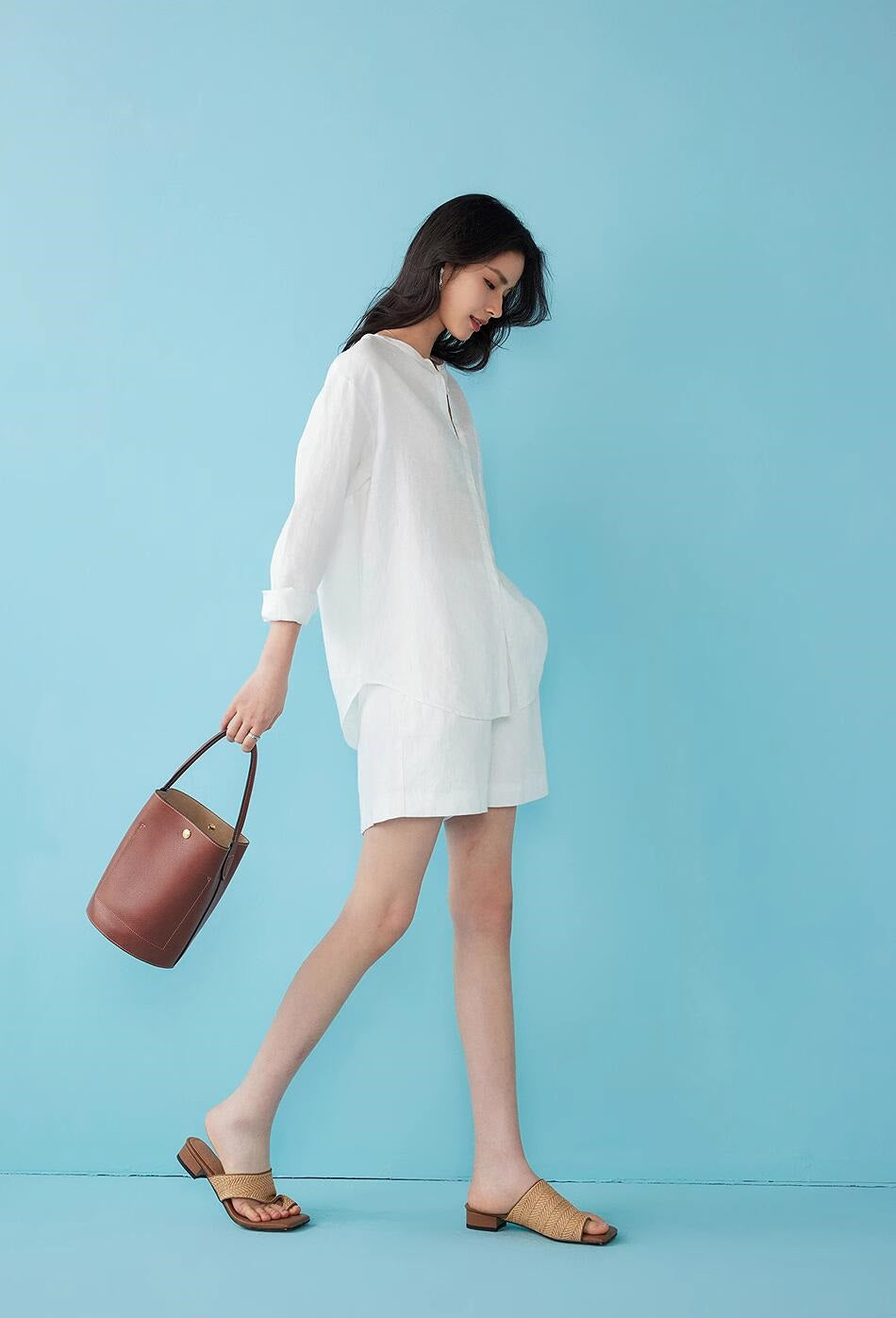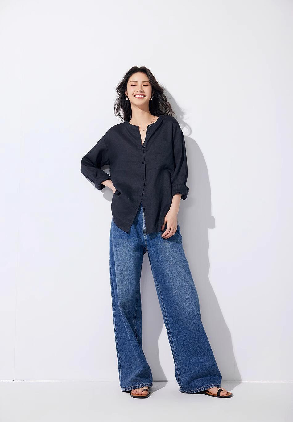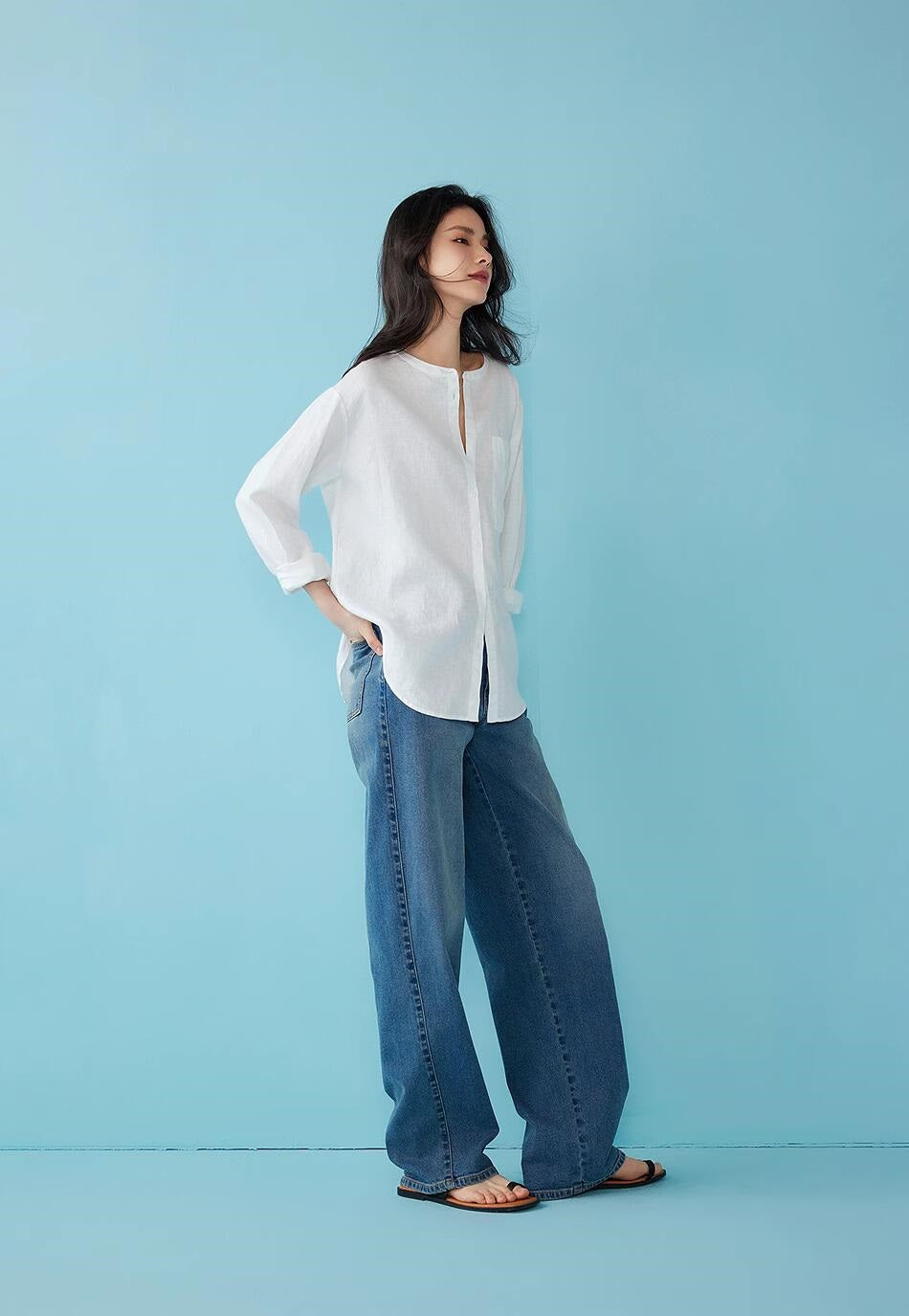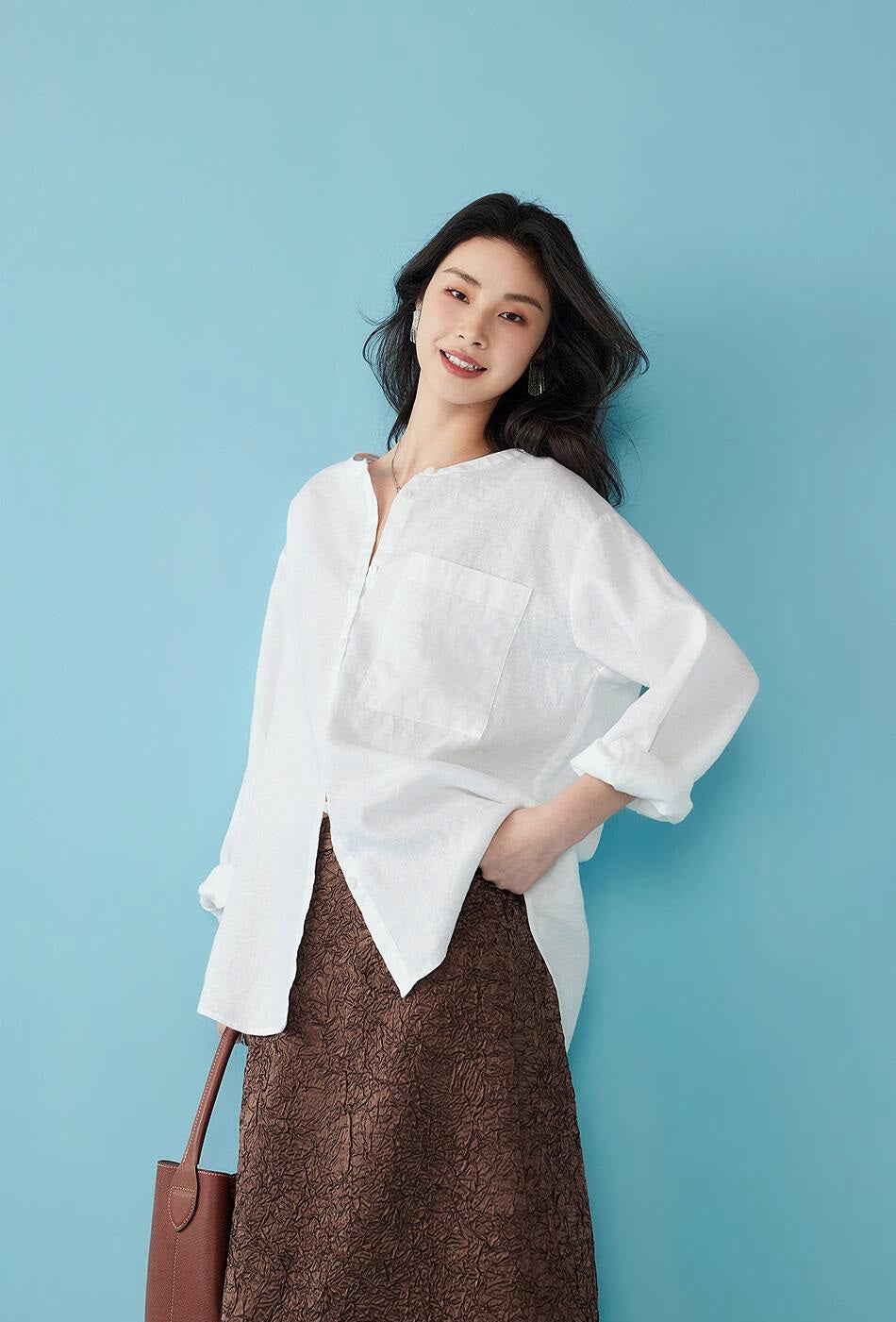 リネン七分袖ラウンドネックシャツ
