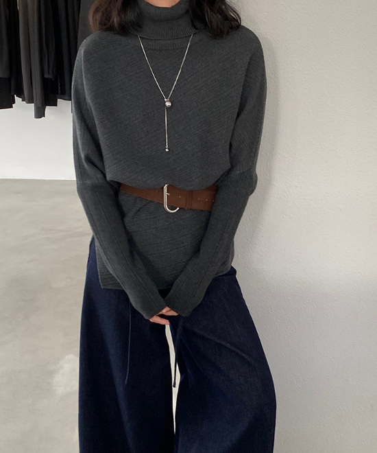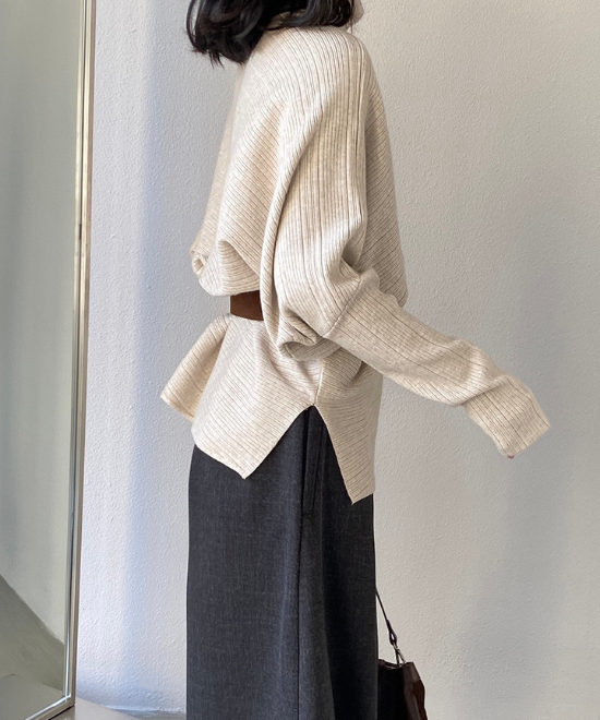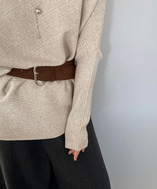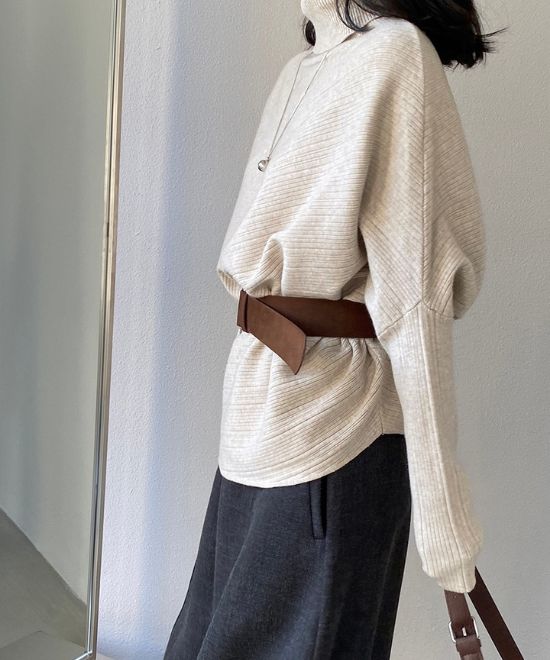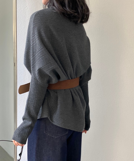 ドルマンスリーブが特徴のセータートップス。肩から肘にかけてゆとりを持たせ、二の腕をカバーをしつつ、バストもカバーできる優秀シルエット。それに加え、ウエストをベルトでマークする事で腰周りをすっきり見せれて、メリハリのあるシルエットを構築。やや長めな丈なことで、ベルトでたゆませたりとバランス調整が効き、ボトムス合わせに困ることなく、こなれた印象に仕上げてくれます。