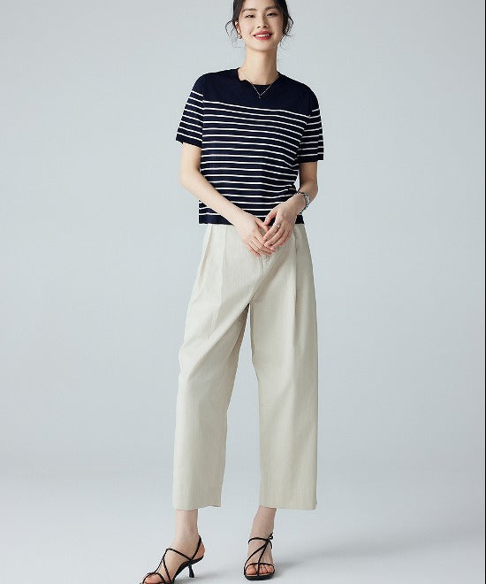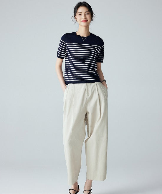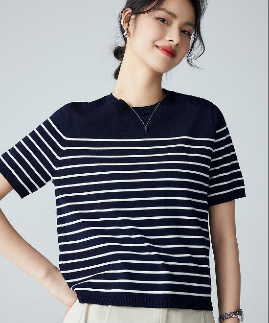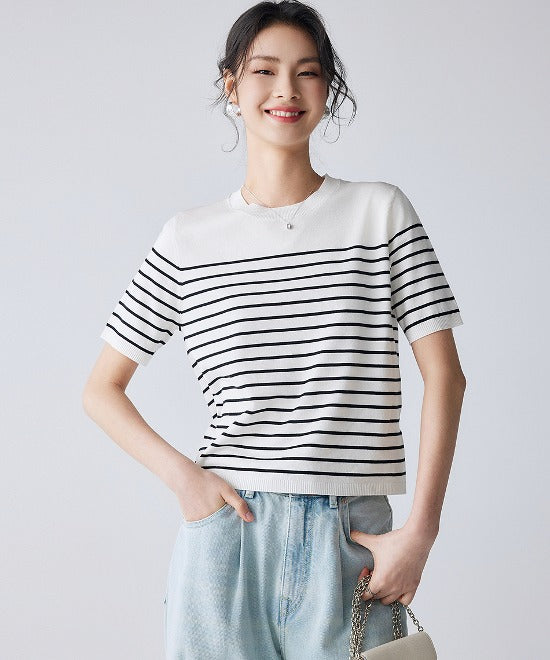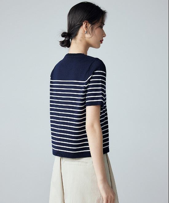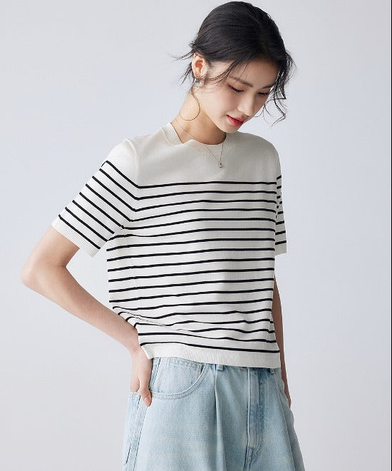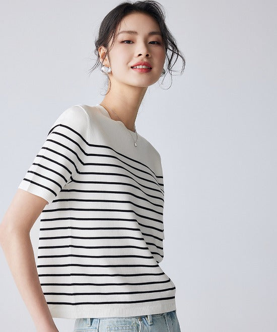 ミニマルトップスにボーダーデザインをあしらった一枚。タックパンツやワイドボトムスとも相性◎ニット素材で着心地もよくテイスト選びません。デイリーにも活躍するアイテムでスタイルアップが叶います。