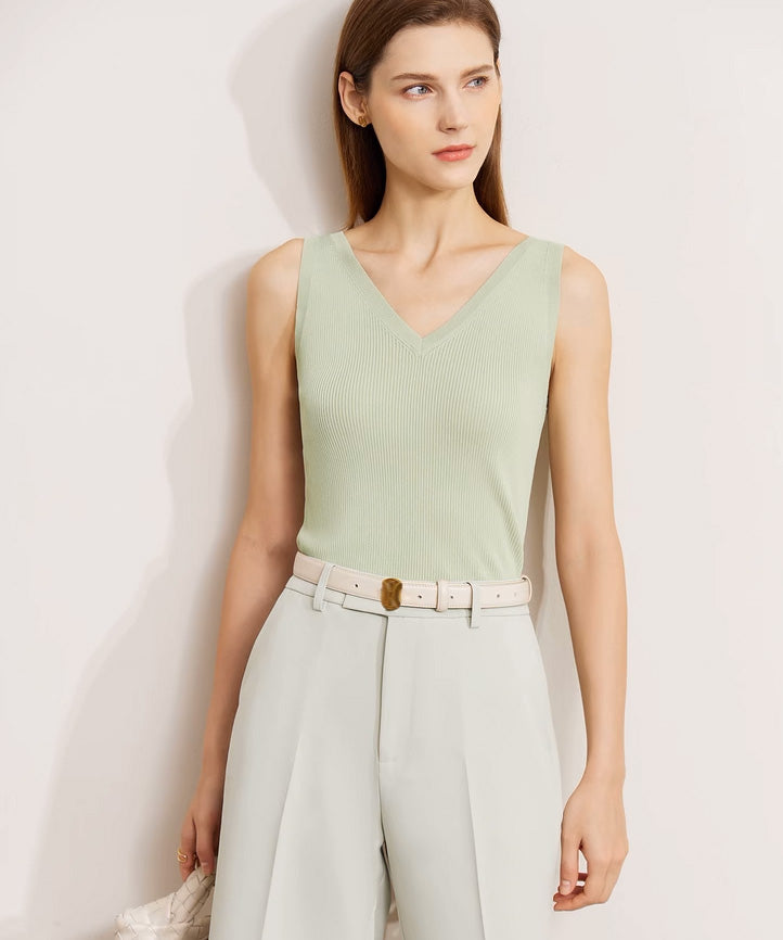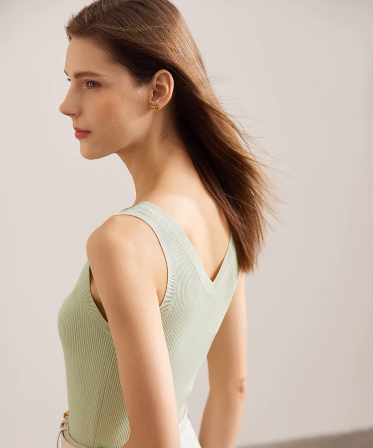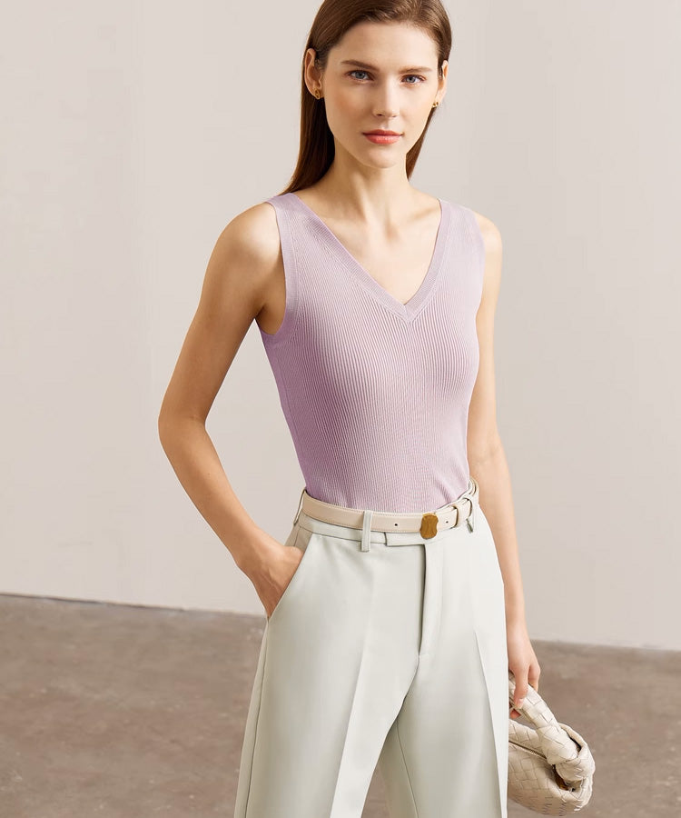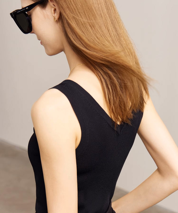 胸元をすっきり魅せる大胆なVネックと細いリブが肌に映え女性らしさを高めてくれます。伸縮性があり着心地もよく、1枚着はもちろん、シアートップスとレイヤードしたりと、様々な着こなしのアレンジも楽しめるアイテムです。