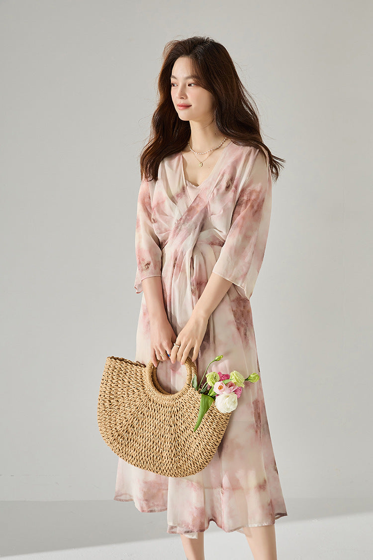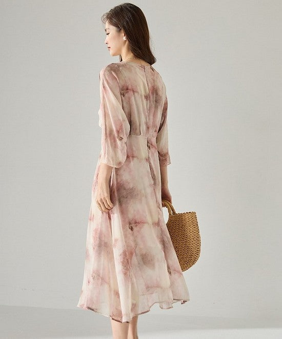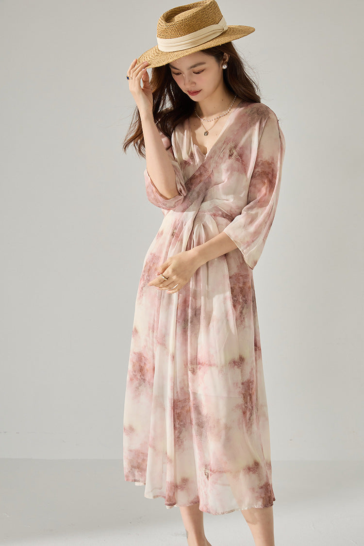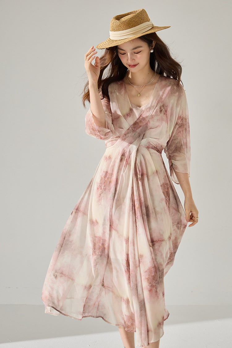 Vネックプリントシフォンワンピース