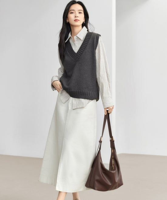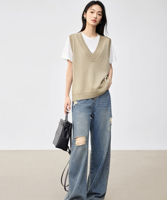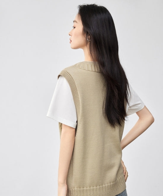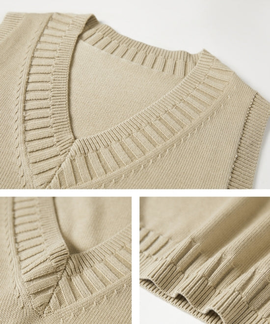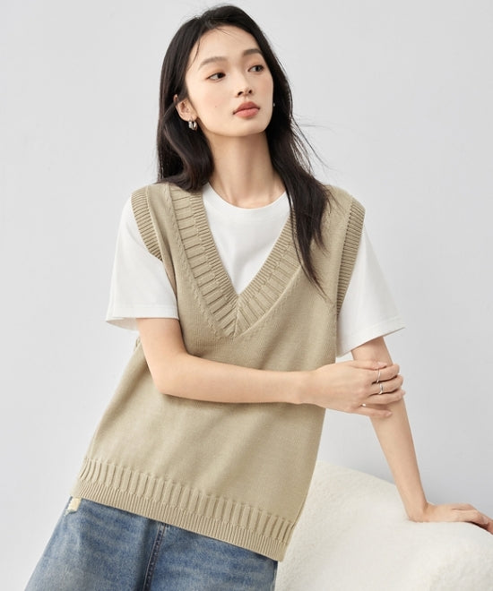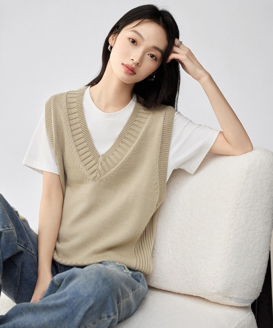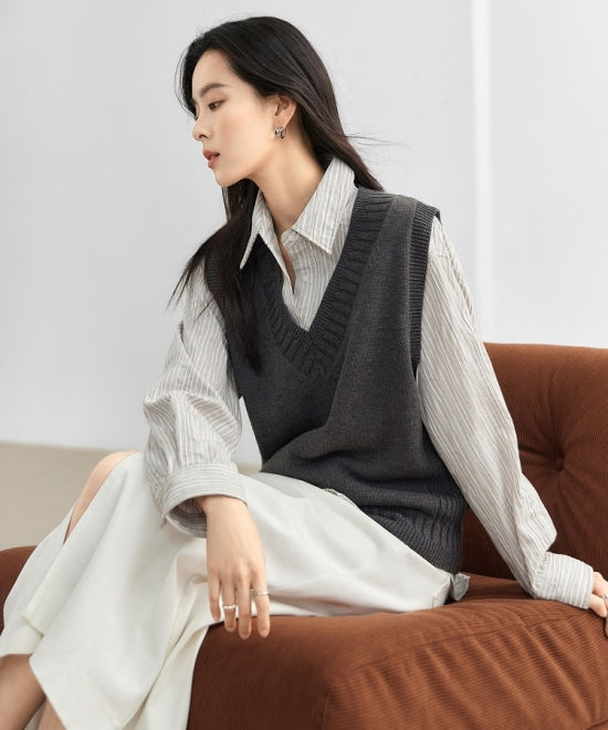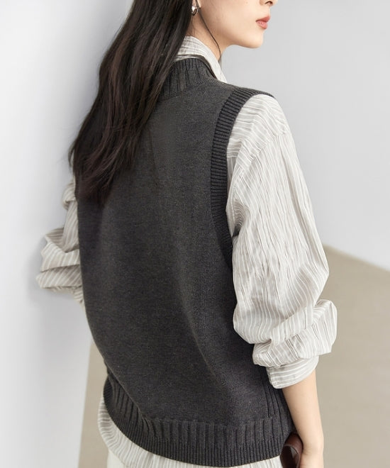 シンプルでベーシックなVネックウールベスト。シャツだけでなくTシャツやワンピースなどと合わせるのもおすすめ。カラーはダークグレーとベージュの2色展開で、カジュアルなスタイルにもきれいめなスタイルにもマッチし、どちらのコーディネートにも使いやすい一着です。