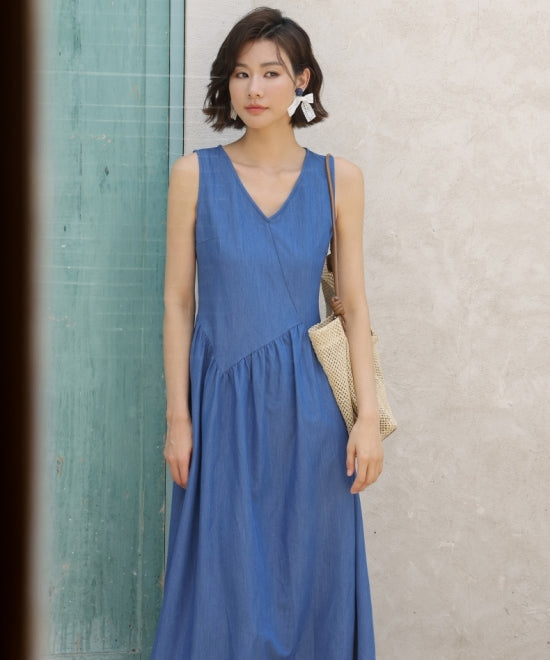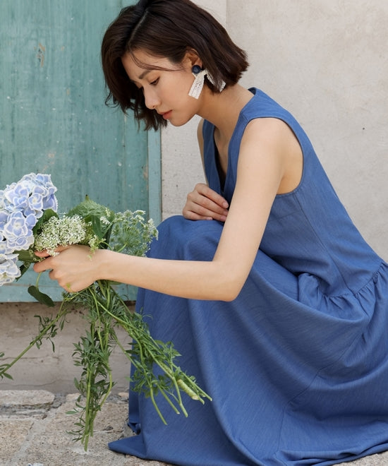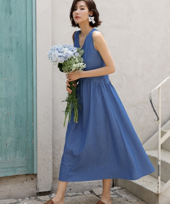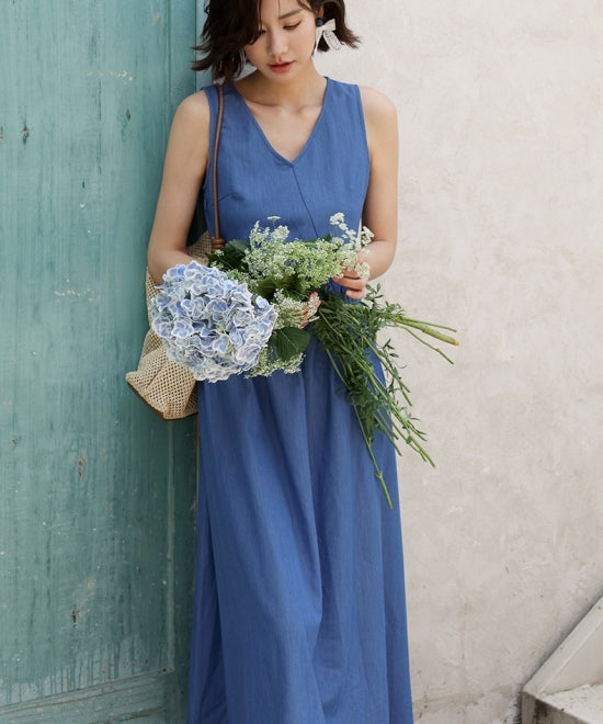 こちらのシンプルで綺麗なブルーのノースリーブワンピースは、Vネックデザインが特徴。ゆったりとしたシルエットがリラックス感を与え、ウエスト部分にはギャザーが入っており、女性らしいラインを強調します。ロング丈で上品な印象を与えつつ、日常使いにもぴったり。涼しげで爽やかなブルーが夏の装いにぴったりです。カジュアルにもきれいめにもコーディネートしやすい一枚で、様々なシーンで活躍します。