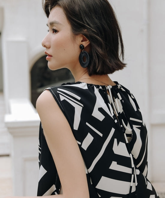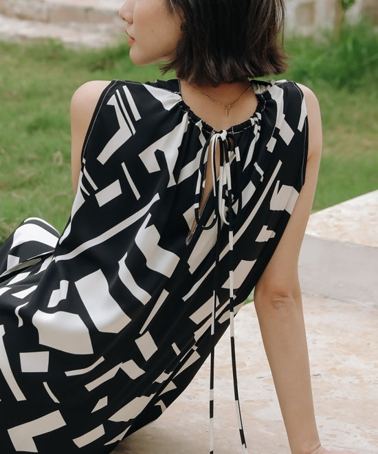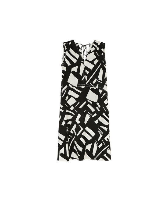 バックリボン黒白アートプリントノースリーブワンピース