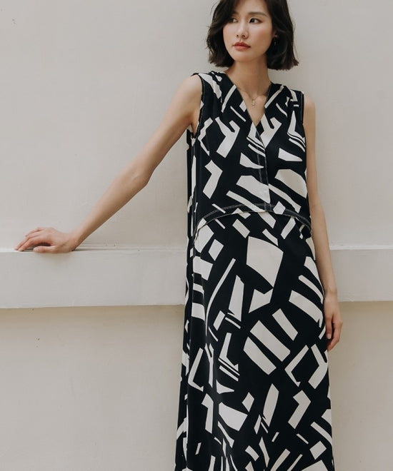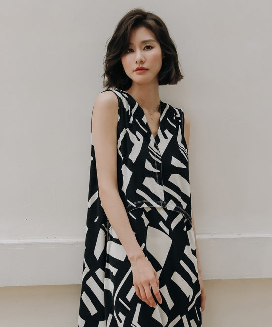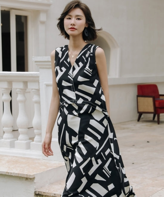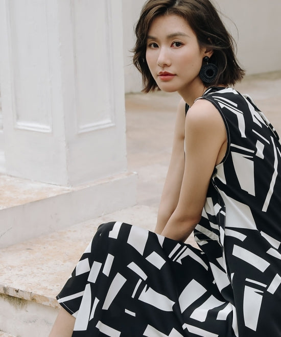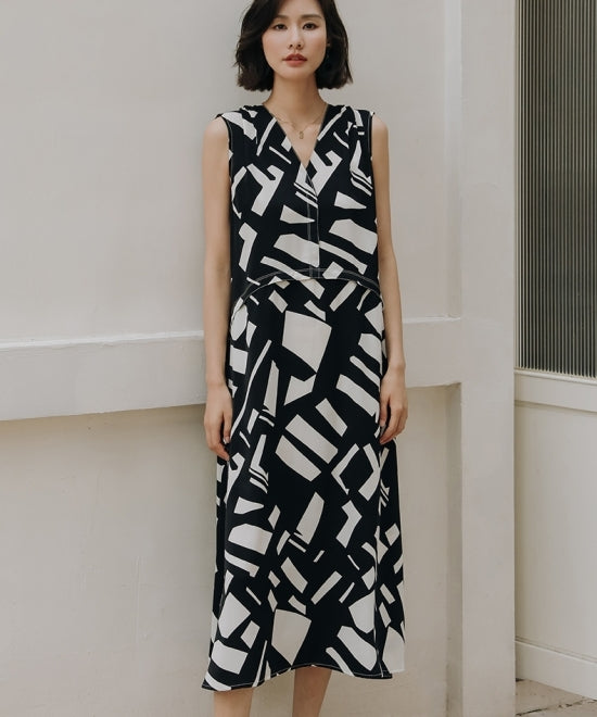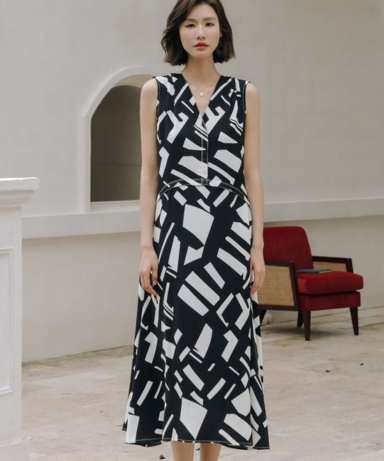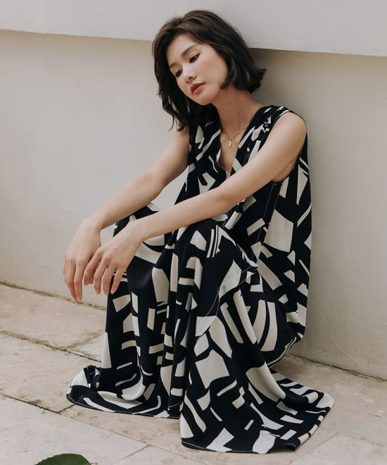 大胆なアート柄プリントが目を引くこのノースリーブワンピース。エレガントさとモダンさを兼ね備えた一着です。Vネックのデザインがデコルテを美しく見せ、Aラインシルエットが女性らしいラインを引き立てます。上品で洗練された印象を与えるこのワンピースは、フォーマルな場面からカジュアルな日常まで、幅広いシーンで活躍。高級感のある素材感と美しいプリントで、他とは一線を画すスタイルを楽しんでください。