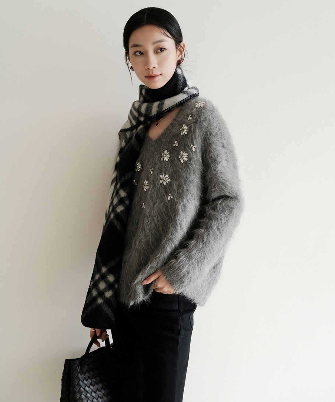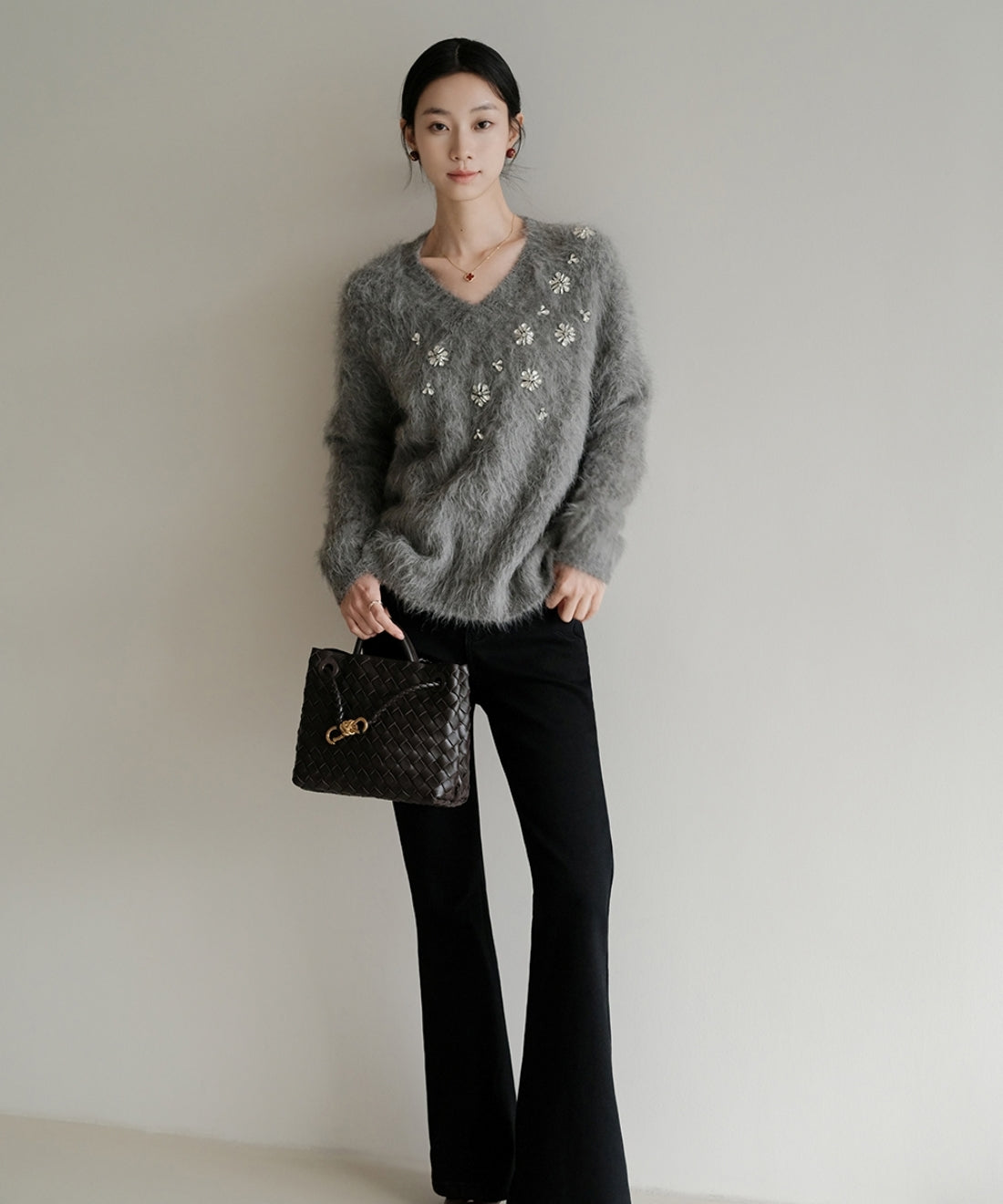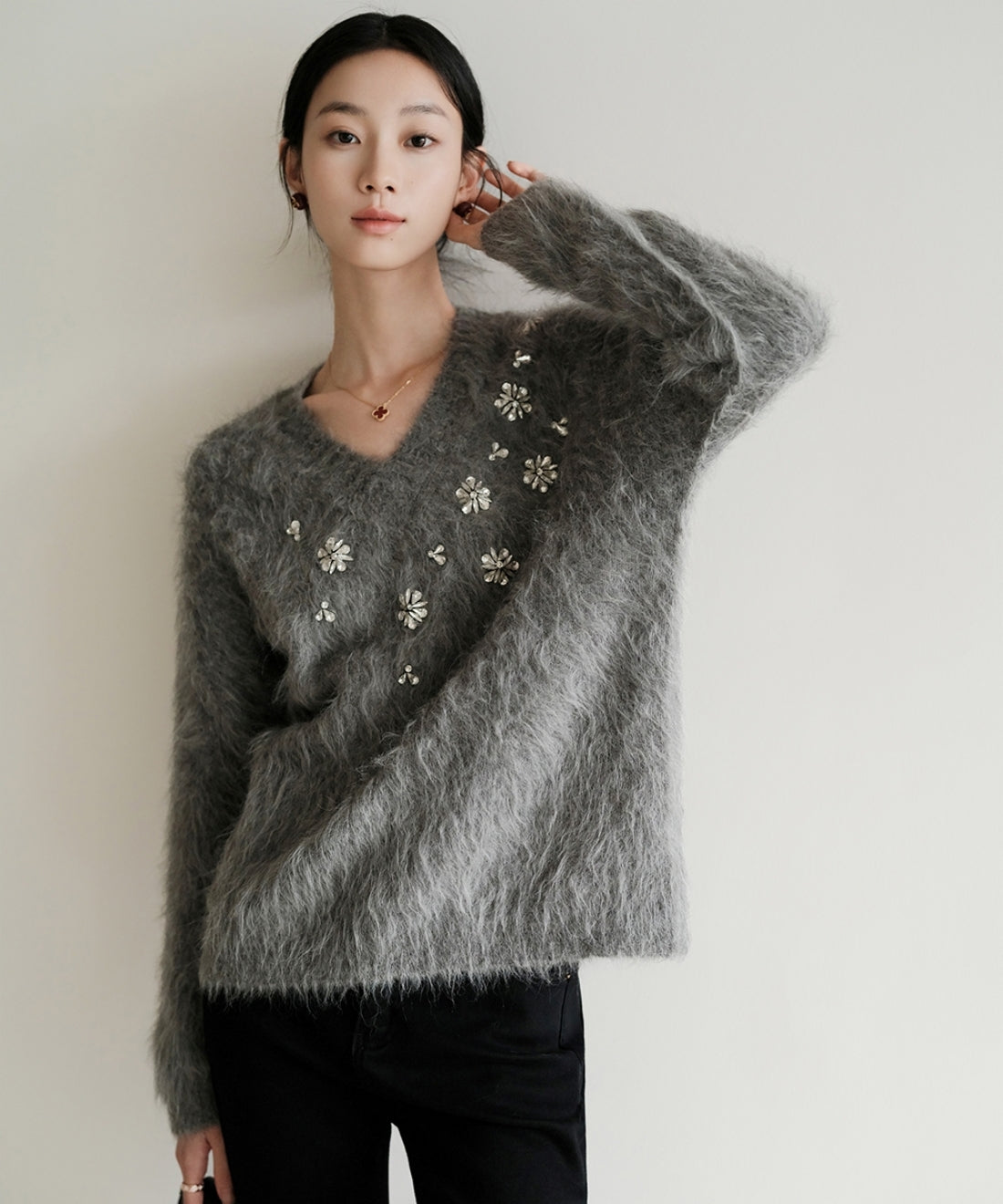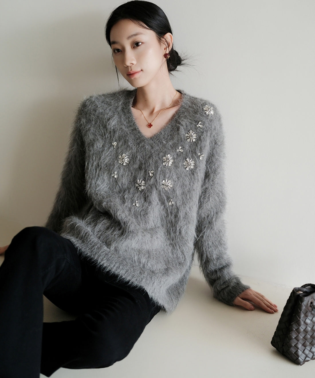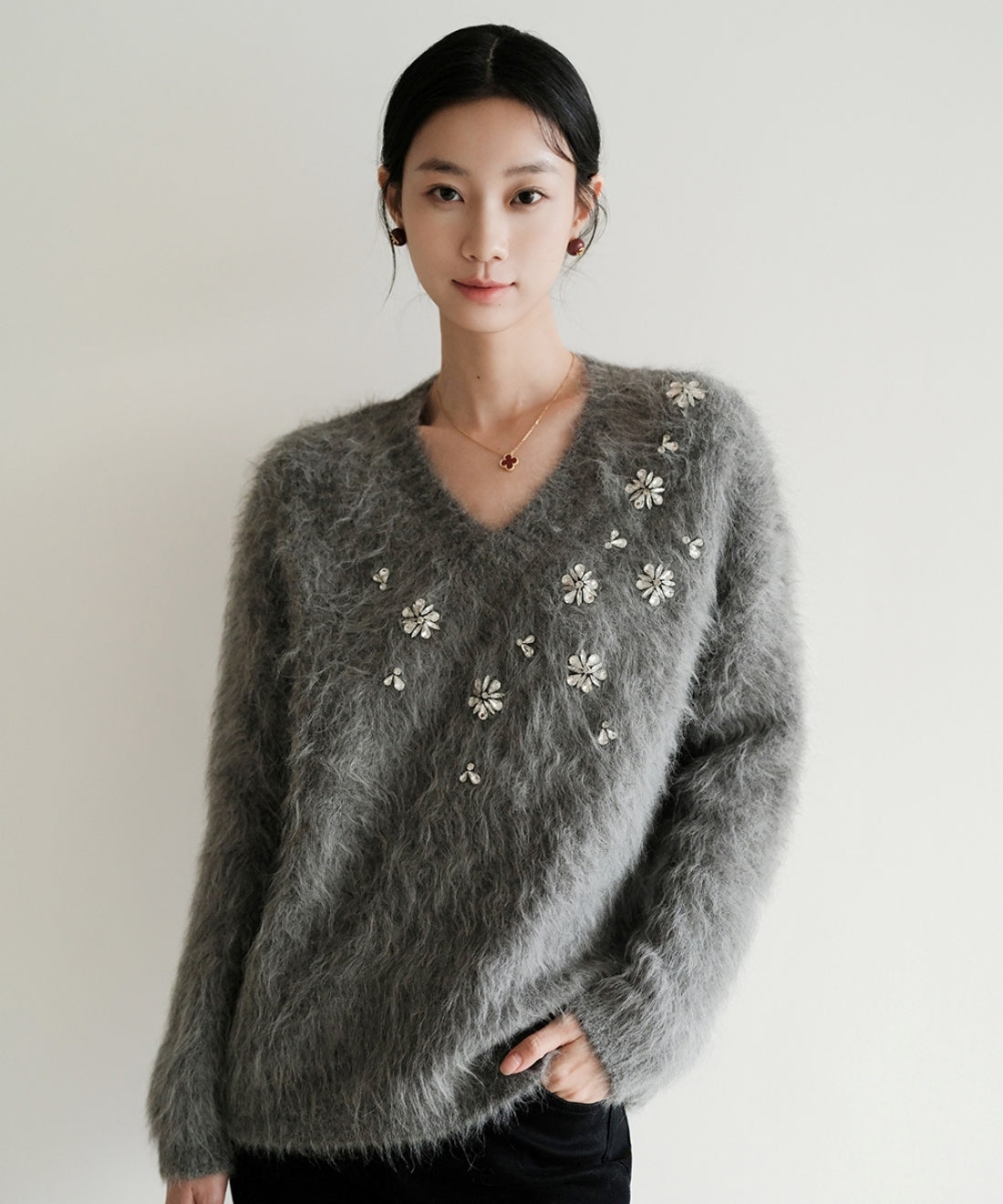 フラワービジューVネックニットプルオーバー