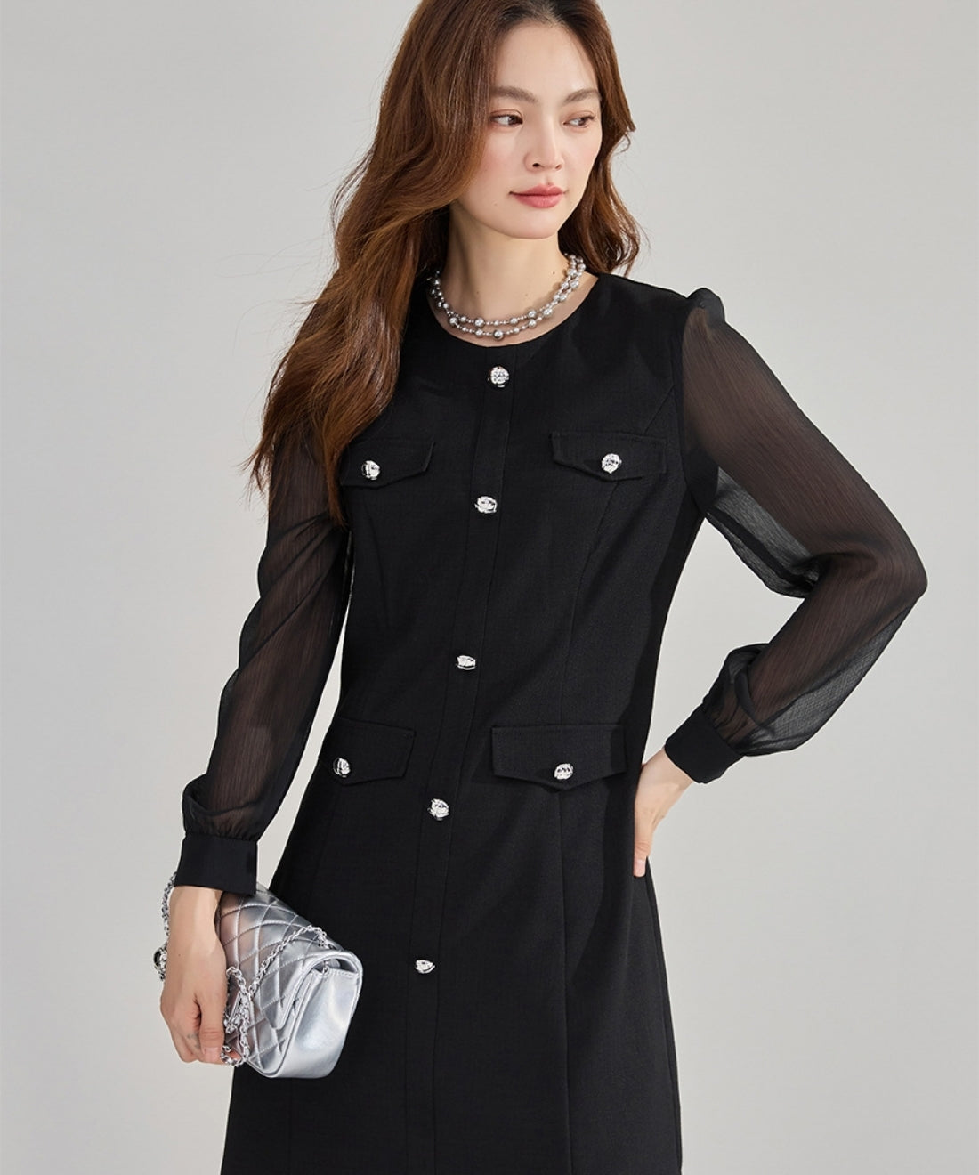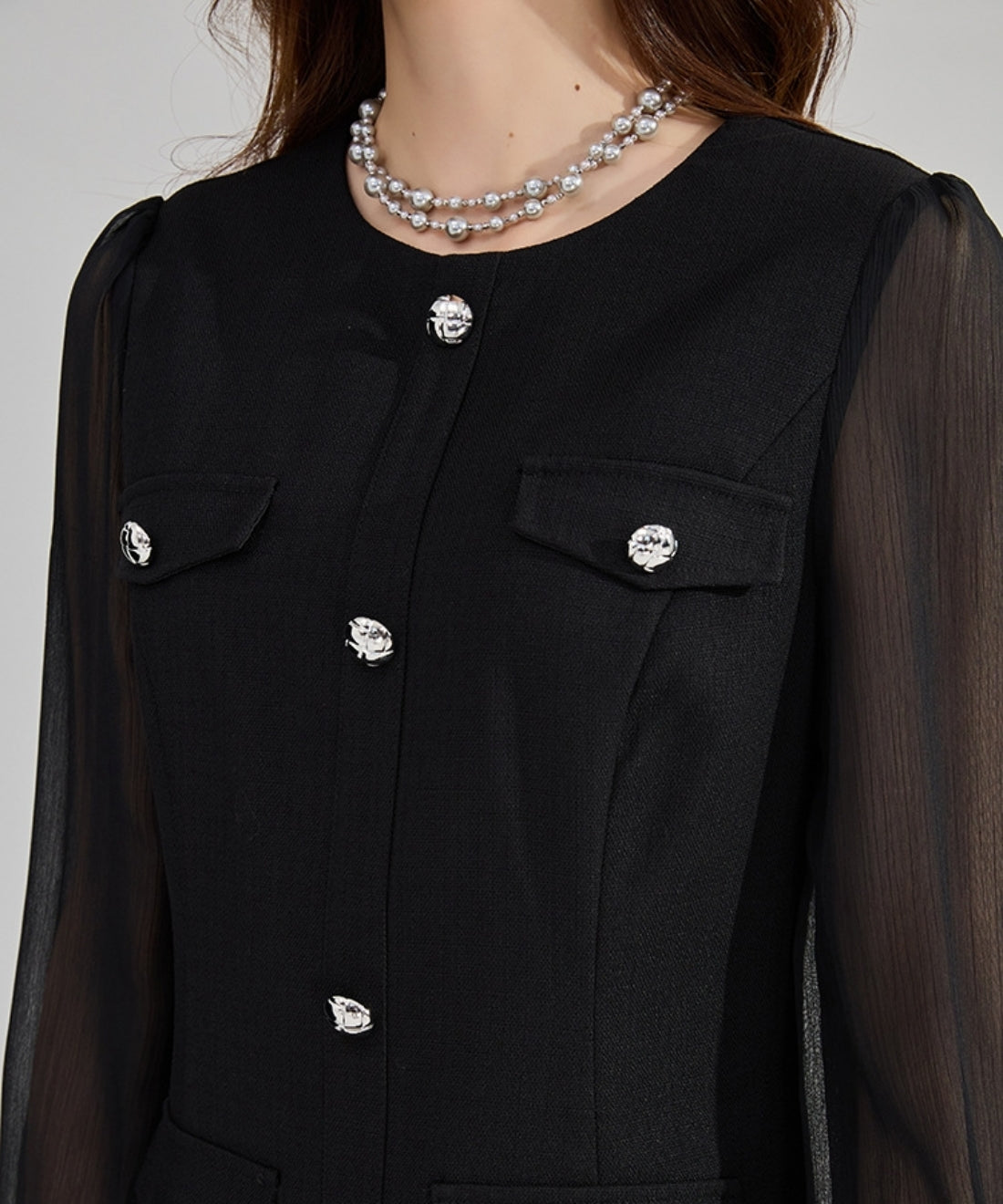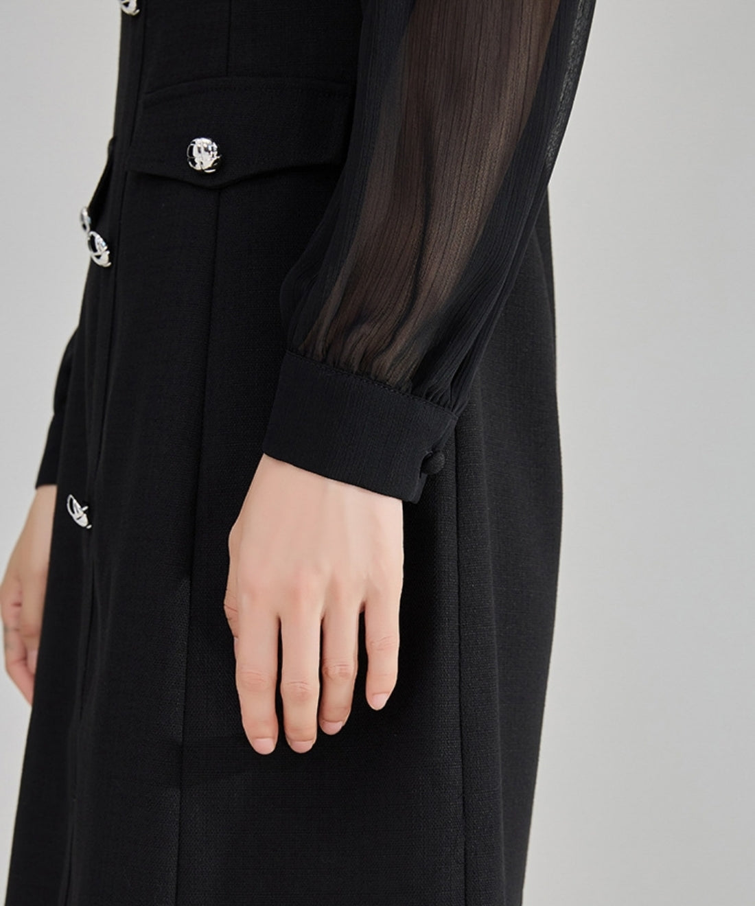 シフォンスリーブ切り替えシルバーボタンミニワンピース