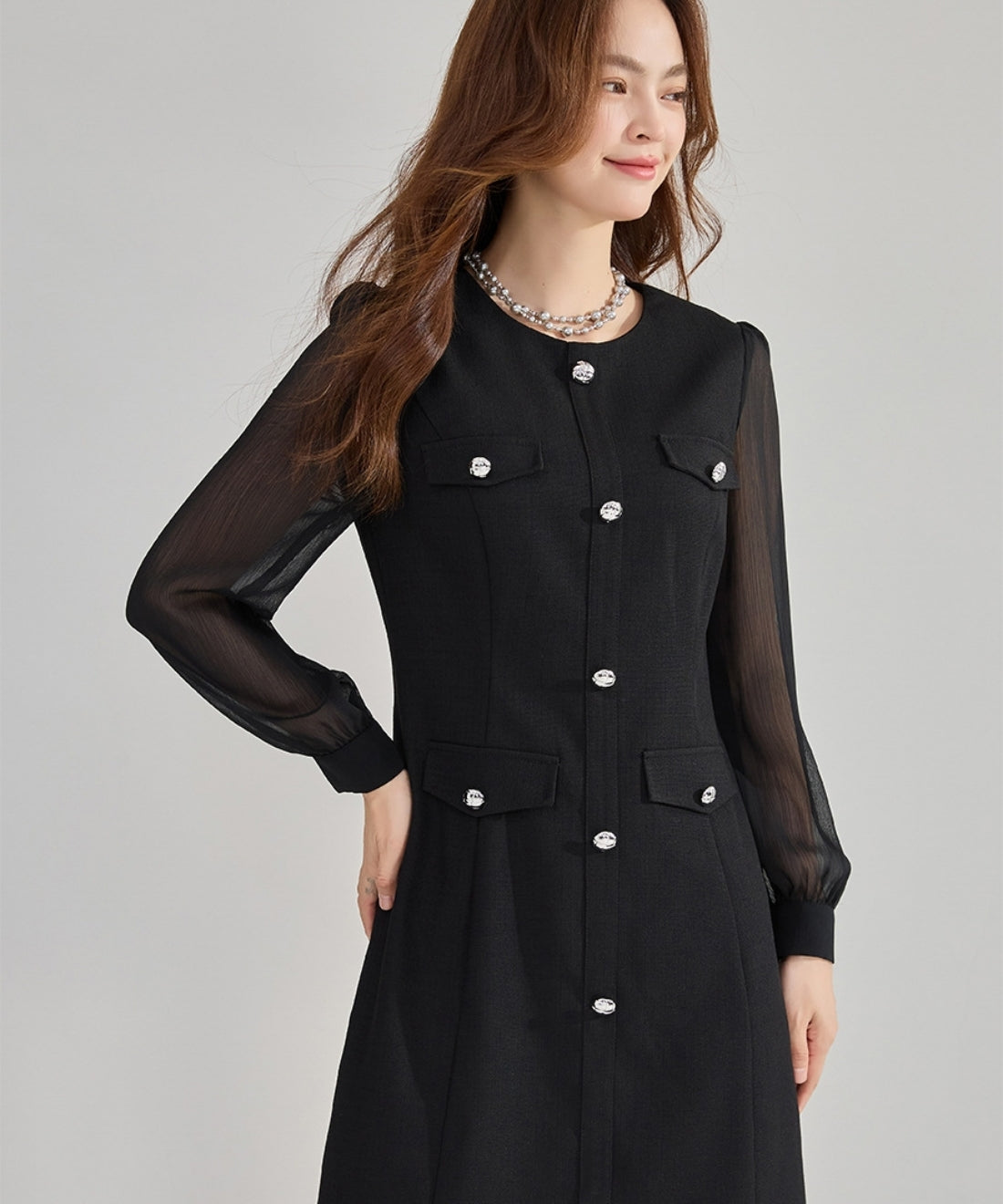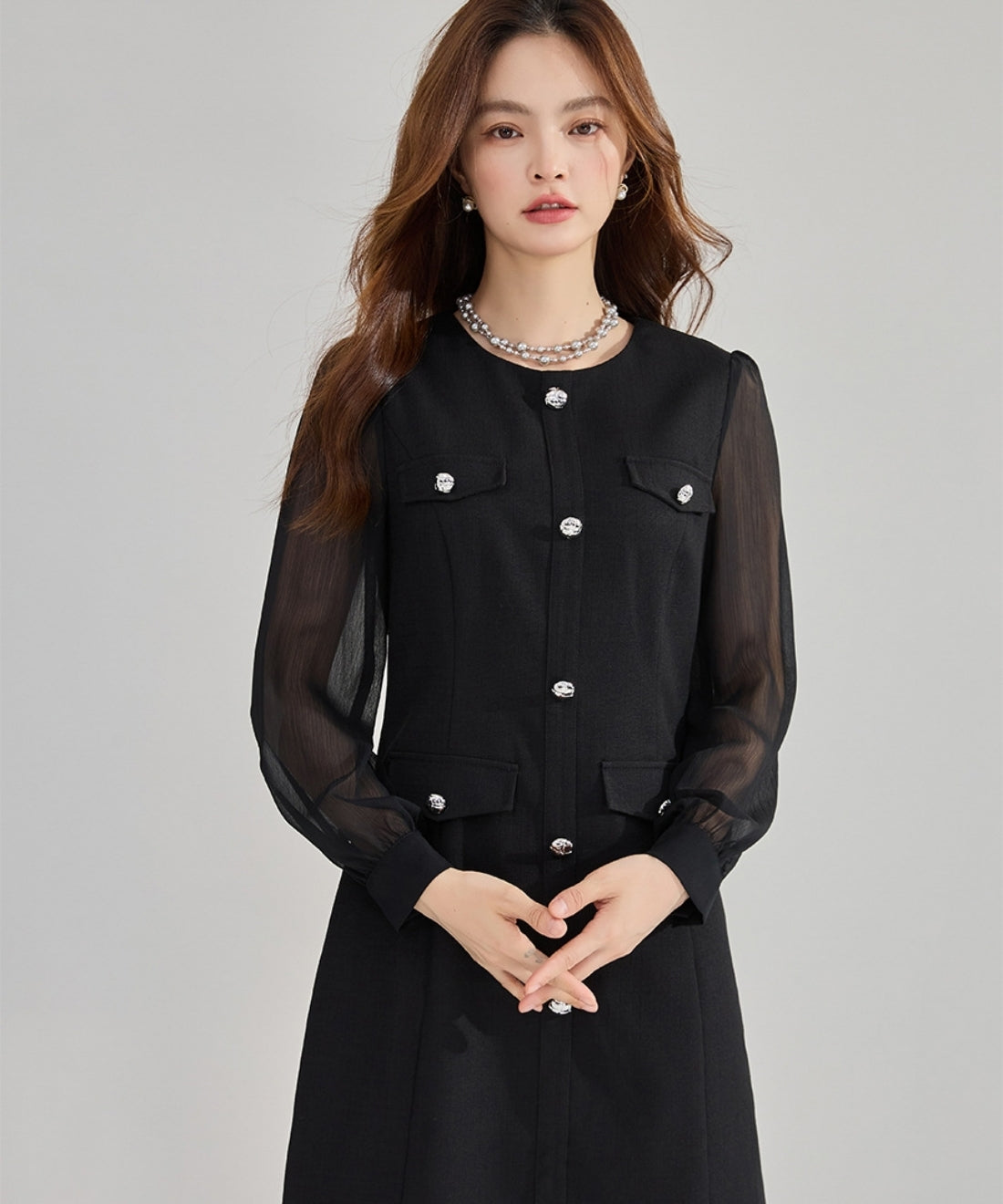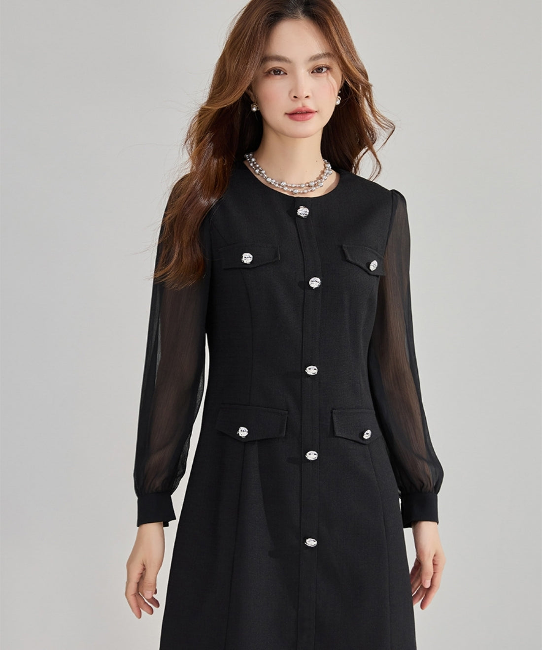 シフォンスリーブ切り替えシルバーボタンミニワンピース
