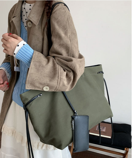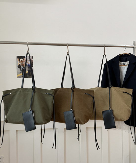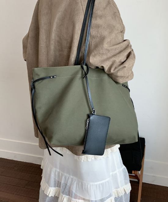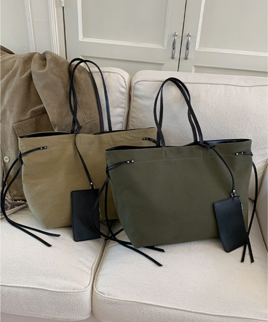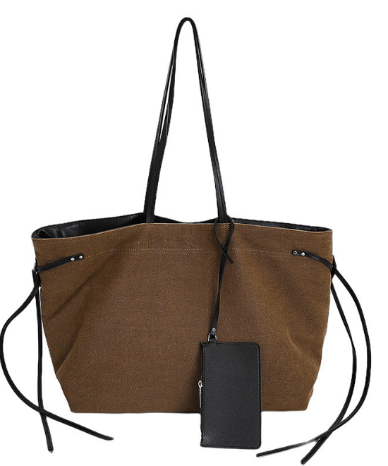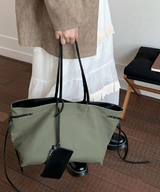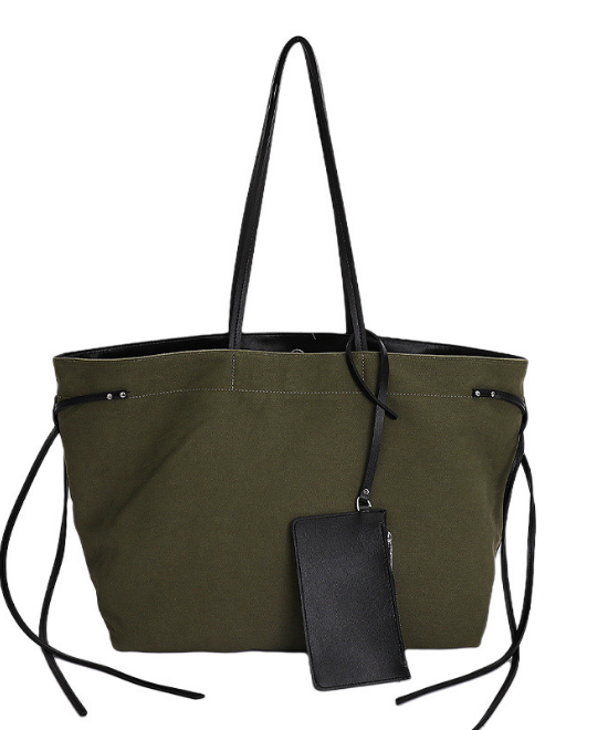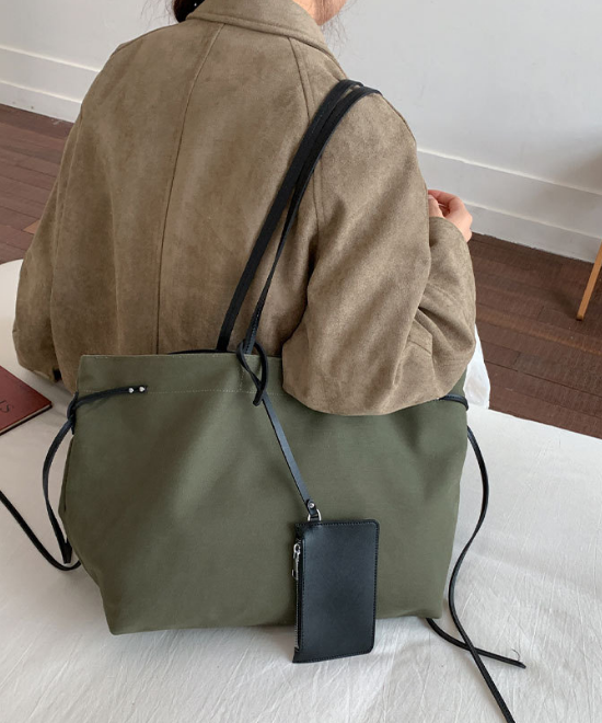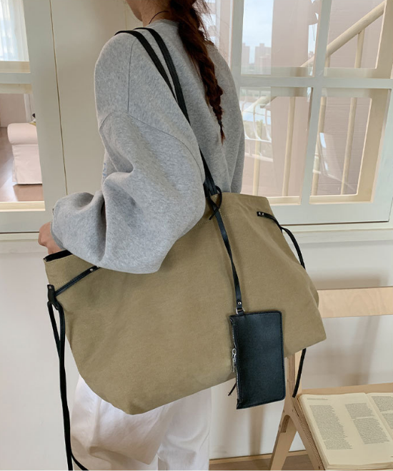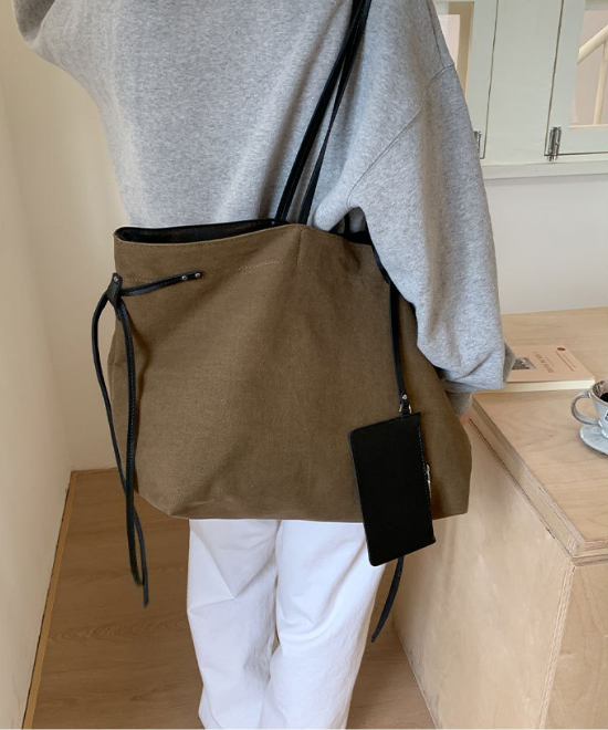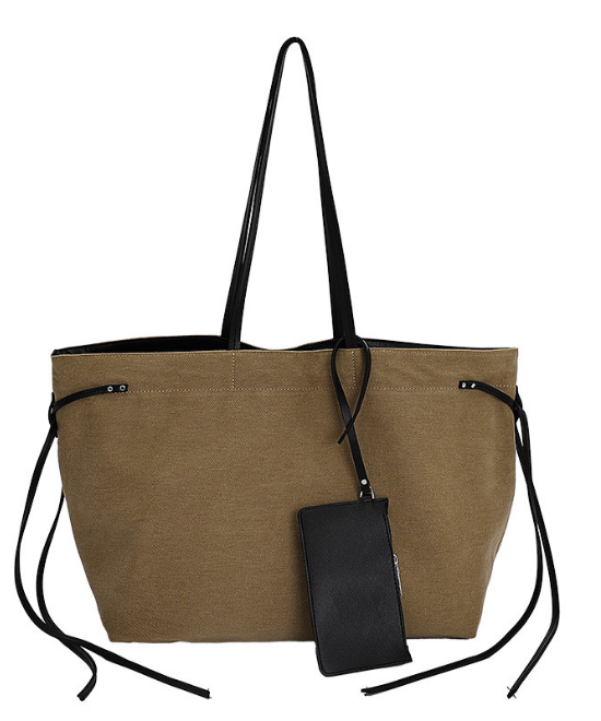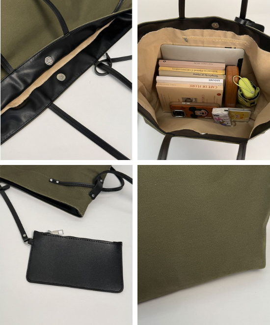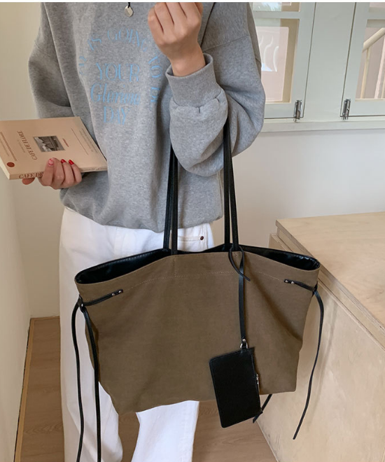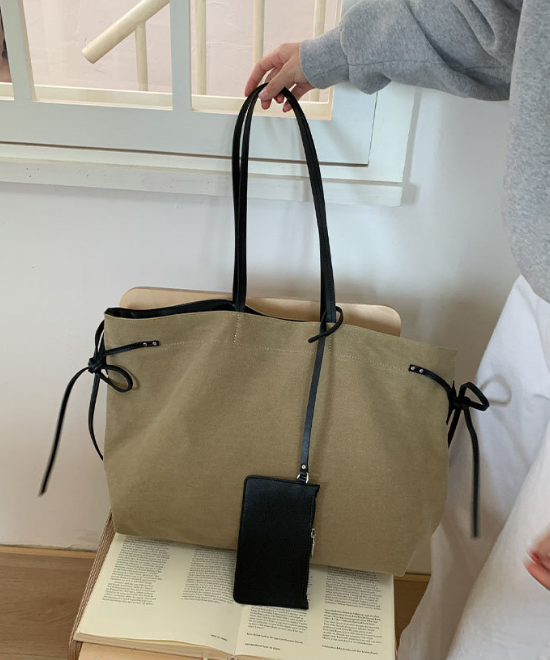 大容量レザーリボンコントラストキャンバストートバッグ