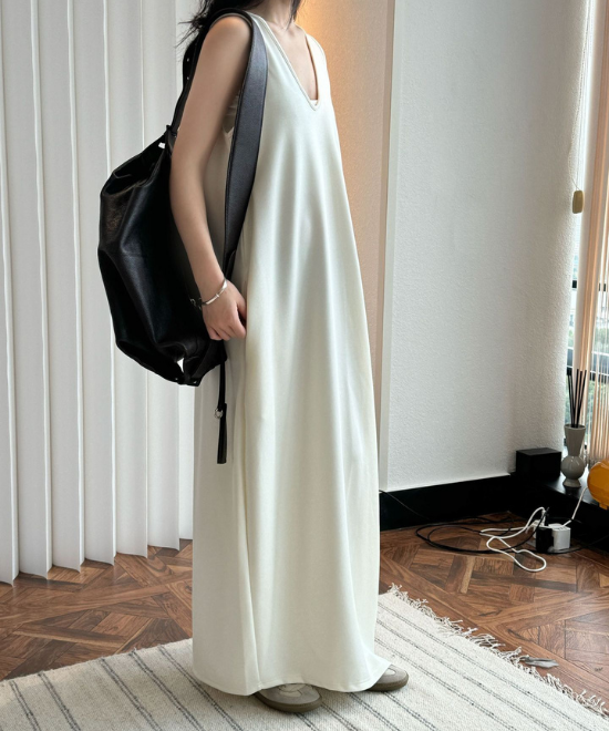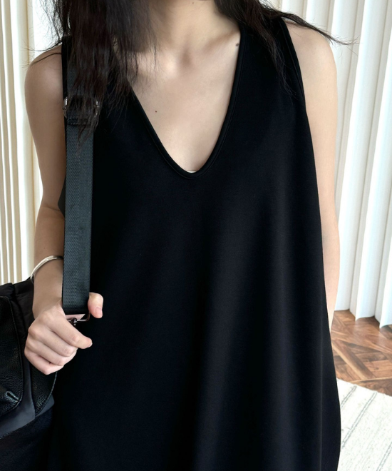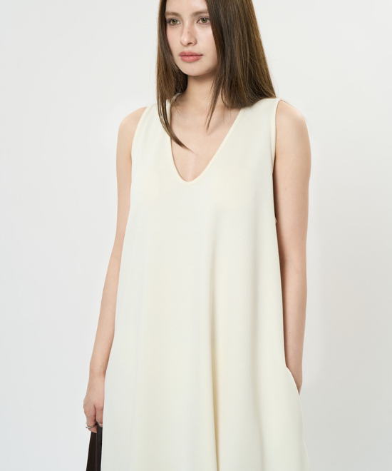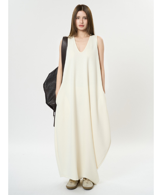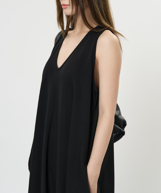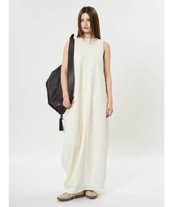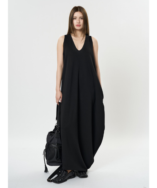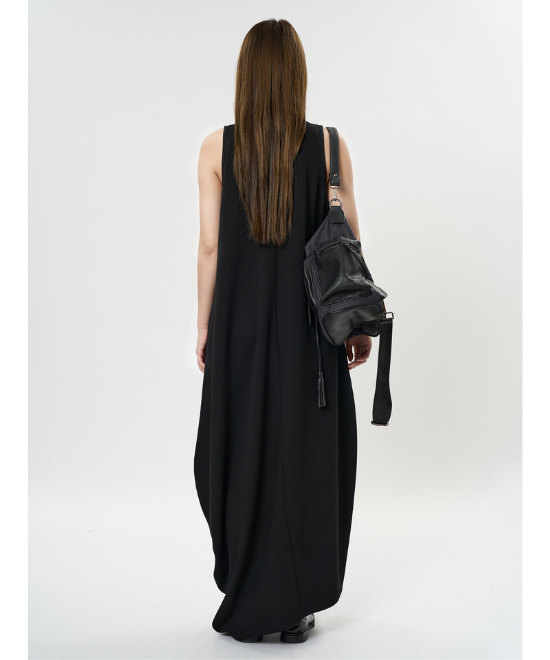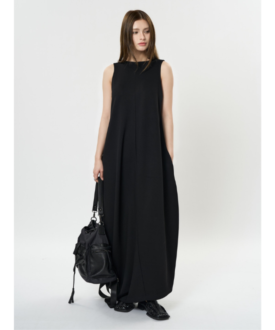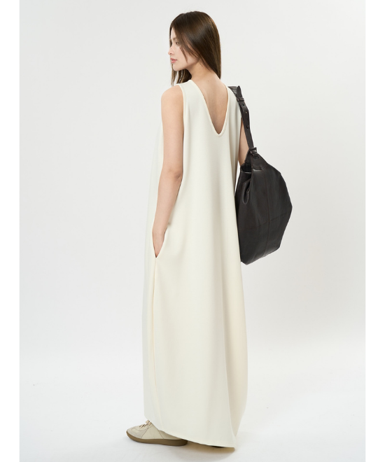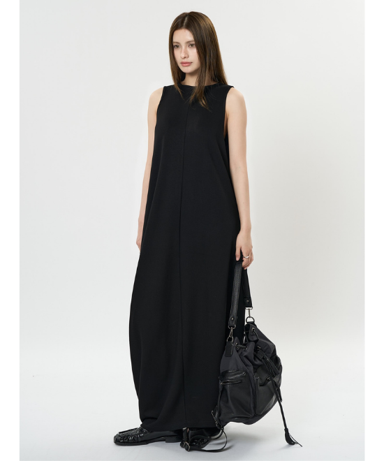 オーバーサイズのノースリーブワンピース。ゆったりと余白を持たせラクな着心地のまま、キレのあるスタイルを実現できる一枚。胸下から足元に掛けてドレープが美しく、シンプルながらも一枚で完結する万能なアイテム。首元はUネックと詰まったクルーネックと、前後どちらでも着用でき、用途や気分に合わせて着られます。
