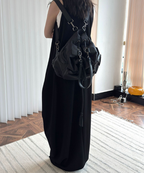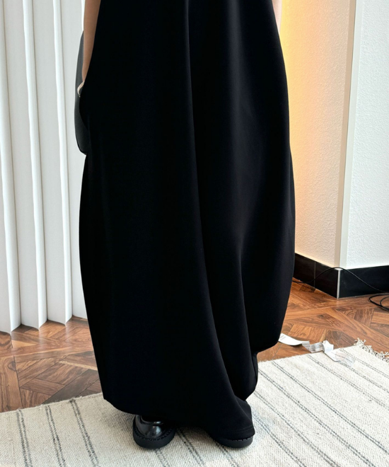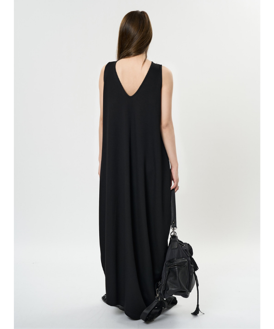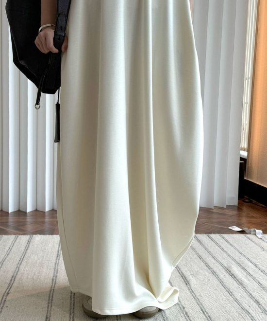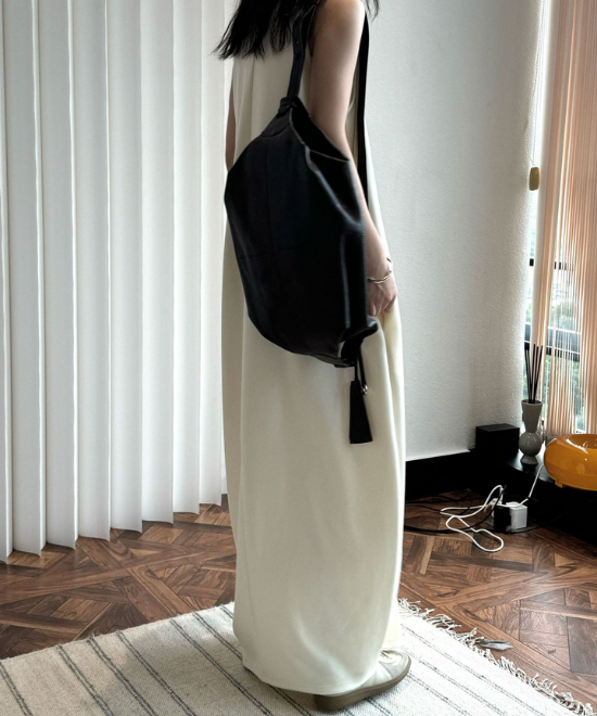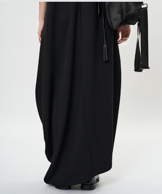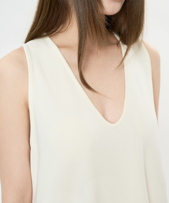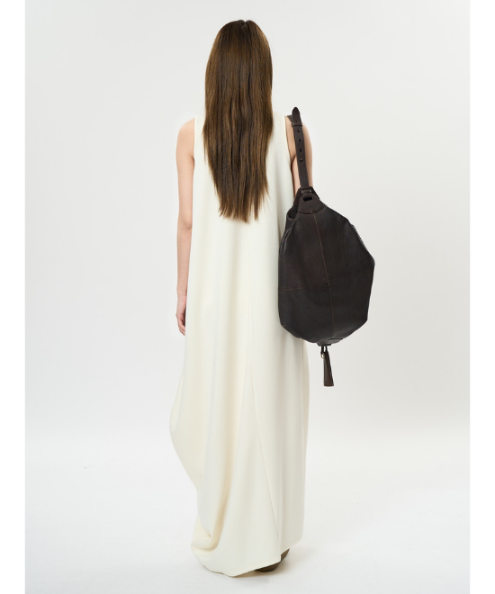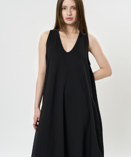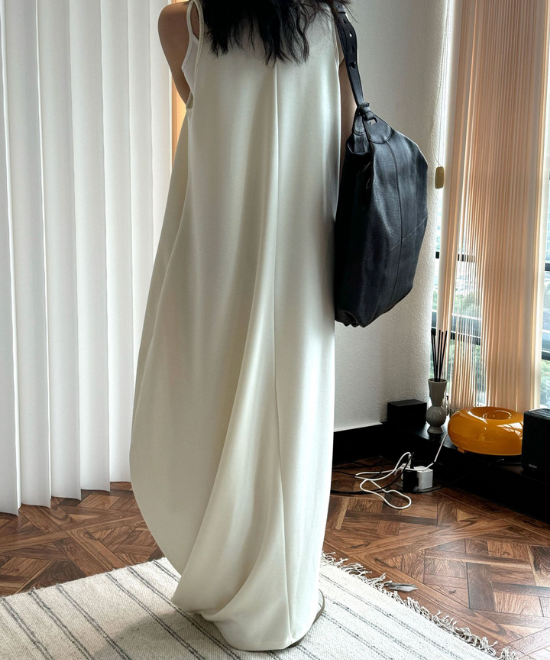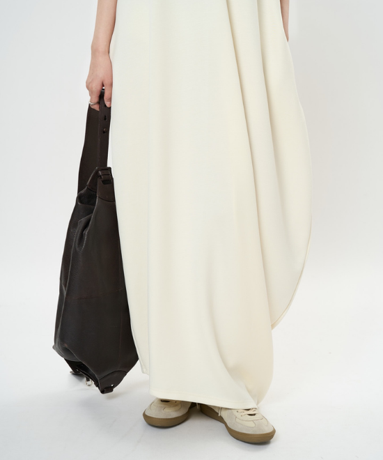 オーバーサイズのノースリーブワンピース。ゆったりと余白を持たせラクな着心地のまま、キレのあるスタイルを実現できる一枚。胸下から足元に掛けてドレープが美しく、シンプルながらも一枚で完結する万能なアイテム。首元はUネックと詰まったクルーネックと、前後どちらでも着用でき、用途や気分に合わせて着られます。