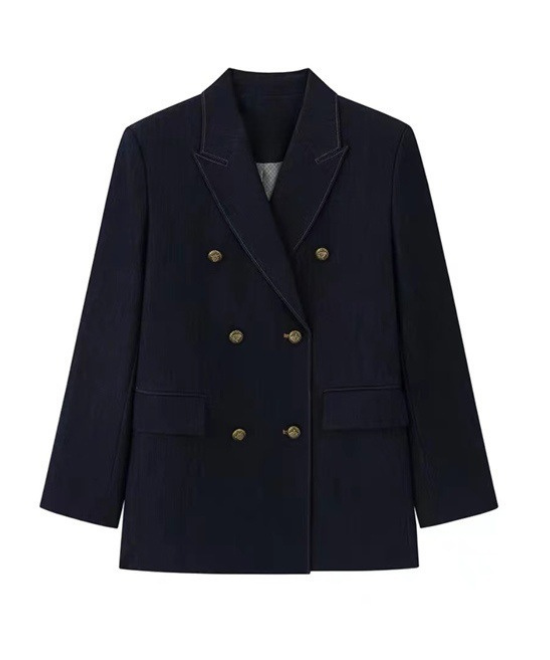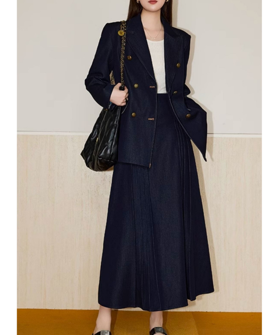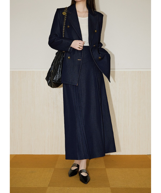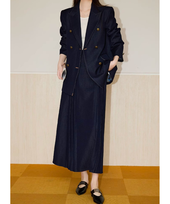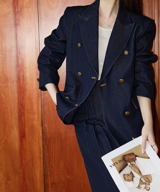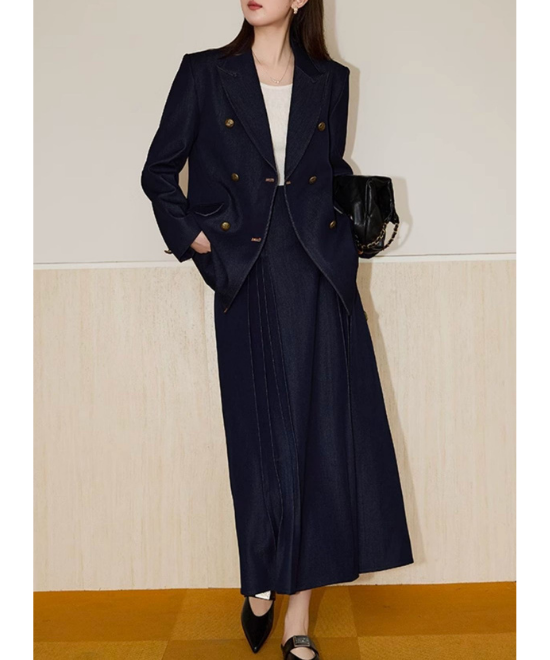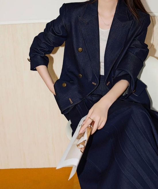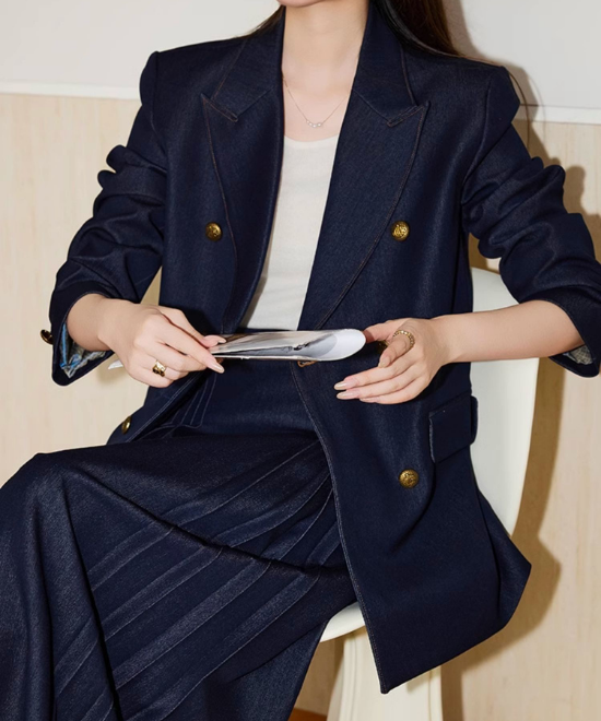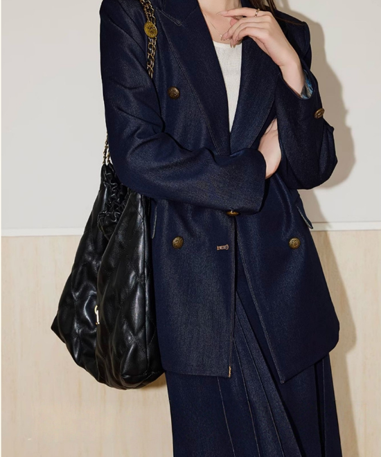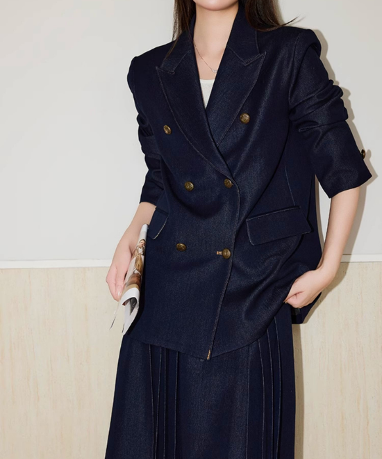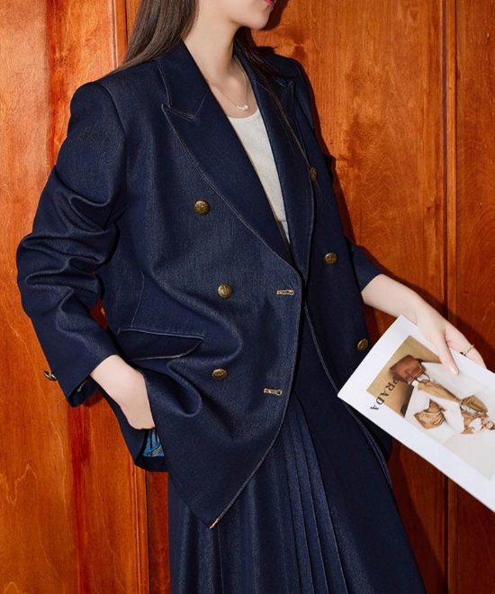 【数量限定】カジュアルを「気品」に変える一癖。大人の体型を美しく削ぎ落とす、金ボタン・デニムダブルジャケット。この一着は、単なるアウターではありません。大人女性を「凛とした人」へと格上げするための、計算し尽くされたデザイン。