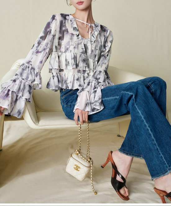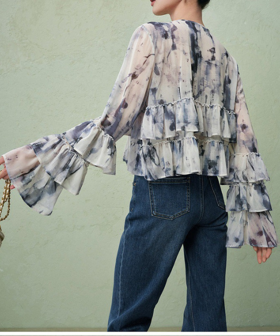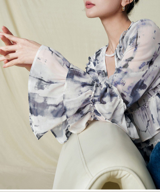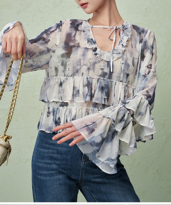 【数量限定】一瞬で、心に春が咲く。顔まわりを華やかに彩る「大人のニュアンス柄」フリルティアードブラウス。