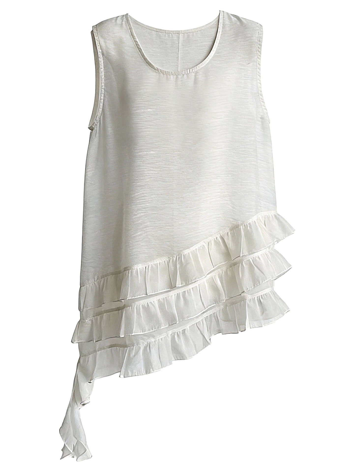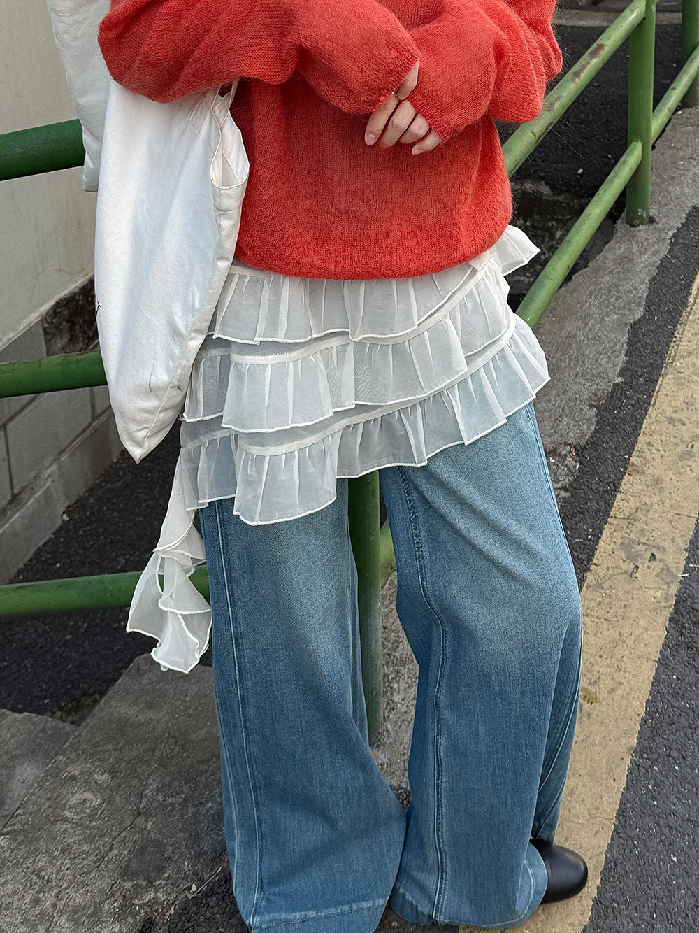白のティアードと聞くと膨らんで見えそうですが、このワンピースは柔らかな落ち感のある素材を採用。裾に向かって広がる段々のフリルが、気になるお腹周りやヒップをふんわりと隠し、動くたびに軽やかな動きを演出。